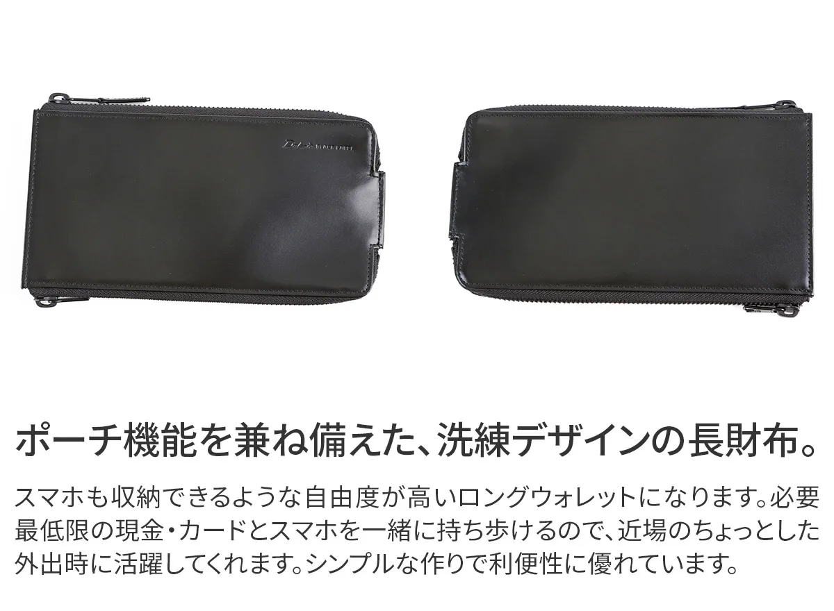 スマホも収納できるようなフリーポケットがついたシリーズ。キャッシュレス化に伴い持ち歩く現金・カードも減っているので、財布にもフリー収納の部分を設けました。貴重品の整理などがしやすい、新しいスタイルのお財布です。 上部と下部にファスナーが付いた、ユニークな作りの長財布になります。下部のファスナーを開けるとフリーポケットになっていますので、スマホやレシート等、自由に収納していただけます。上部ファスナーを開けると、財布になっております。必要最低限の現金やカードを収納していただける、スマートな構造でスタイリッシュにお持ちいただけます。