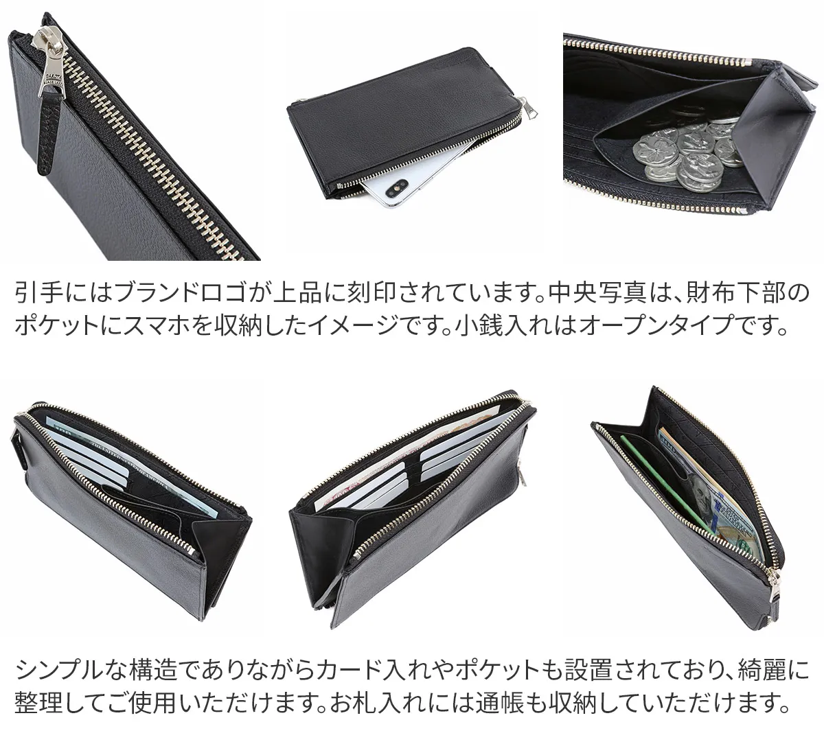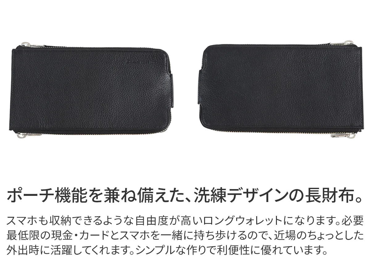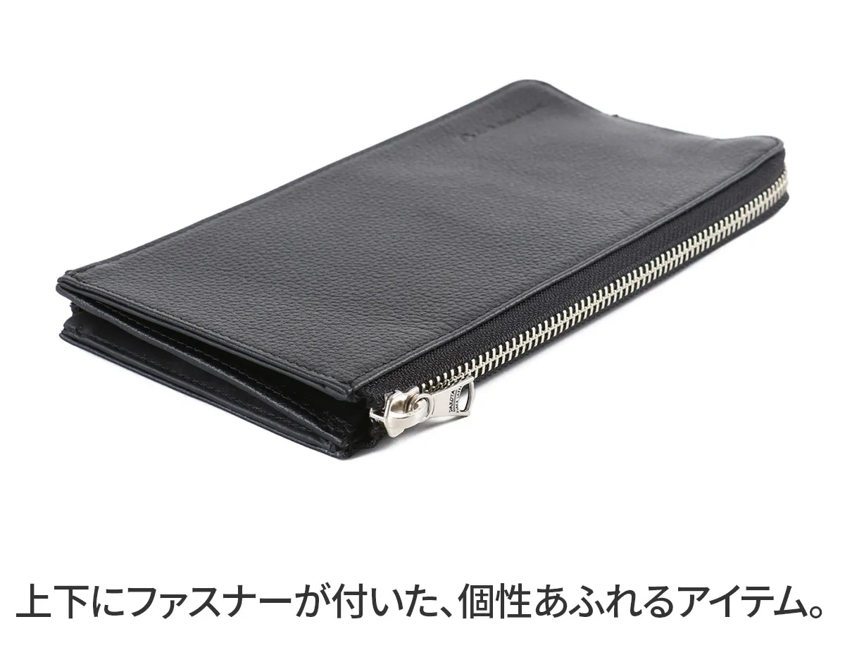 スマホも収納できるようなフリーポケットがついたシリーズ。キャッシュレス化に伴い持ち歩く現金・カードも減っているので、財布にもフリー収納の部分を設けました。貴重品の整理などがしやすい、新しいスタイルのお財布です。 ※皮革保護剤加工が施されていますので、油や水をはじく力が持続し、お手入れが簡単になります。革本来の美しさをより長く保ちます。 上部と下部にファスナーが付いた、ユニークな作りの長財布になります。下部のファスナーを開けるとフリーポケットになっていますので、スマホやレシート等、自由に収納していただけます。上部ファスナーを開けると、財布になっております。必要最低限の現金やカードを収納していただける、スマートな構造でスタイリッシュにお持ちいただけます。