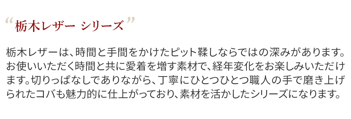 栃木レザーは、時間と手間をかけたピット鞣しならではの深みがあります。 お使いいただく時間の経過と共に、経年変化をお楽しみいただけますので、愛着も増すアイテムとなっております。 切りっぱなしでありながら、丁寧にひとつひとつ職人の手で磨き上げられたコバも魅力的です。 素材を活かしたシンプルなデザインのロングウォレットですので、幅広い年齢層の方に長く愛用していただけます。 ベーシックなカラーバリエーションですが、色によって雰囲気も変わるので、お好みのカラーを見つけてください。 作りもスタンダードで、通帳を収納していただける大きさです。