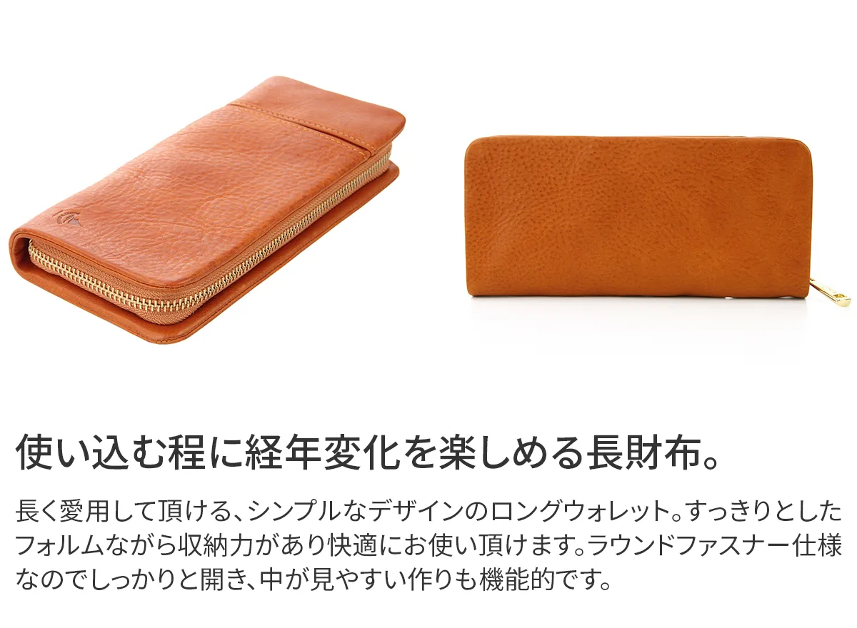 シンプルなデザインですので性別問わずに、男女兼用でお使い頂けるロングウォレットです。お財布本体や細部にブランドロゴが上品に刻印されています。外ポケットは中にカード入れもあり、機能的な作りに加え、デザインの一部になっていてスタイリッシュな仕上がりです。 素材には、イタリアンレザー(ミネルバボックス)を使用しています。イタリアのタンナー「バダラッシィ・カルロ社」で手鞣し、手染めと丁寧に仕上げられた高級な革素材です。植物タンニンで鞣した牛革に、オイルをたっぷりと含ませ時間をかけて作られています。お使いいただく程に、色が深まり、艶やかな表情に育つので、本革ならではの経年変化をお楽しみいただける革素材となっております。