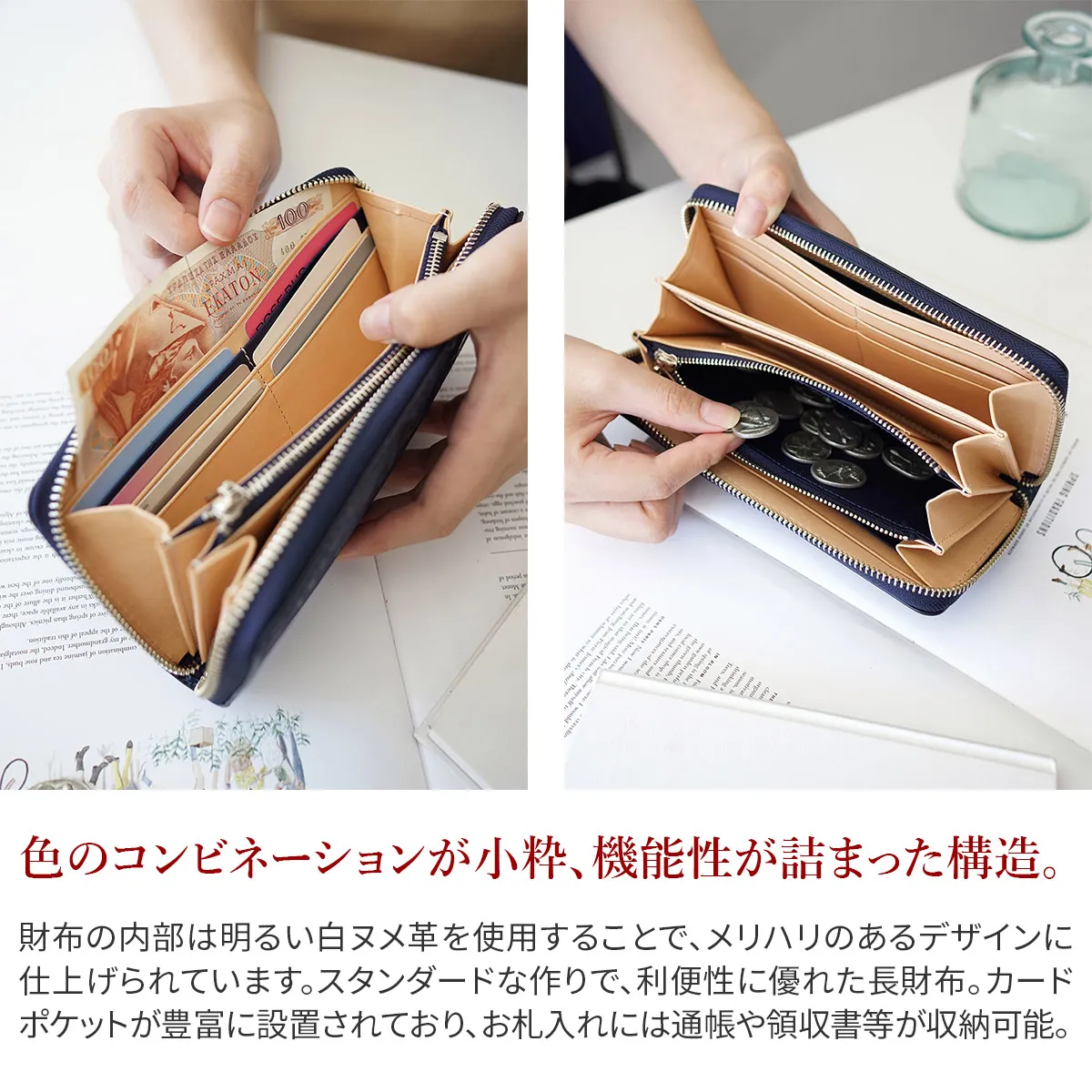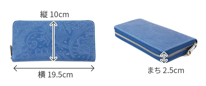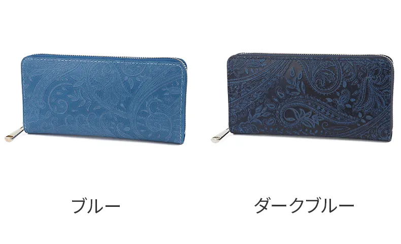 [シリーズ] ペイズリー柄の型押しを施し、浮き出た部分に削りを施すことで、細かい柄まで細部に表現されています。熟練の職人技術により、定番のスムースレザーを奥行のある柄の陰影が美しい存在感のある革へと変化させています。内側は明るい白ヌメカラーにすることで、メリハリのあるデザインに仕上げられています。 [藍染レザー] 藍で染色されたレザーを使用しています。革を一度真っ白に白鞣しを施し、藍の染料に漬けた後、一度乾かします。その後、余分な染料を水で洗い流して干す。この工程で一回染色となります。こちらの藍染めカラーは8回、20回。全て一枚一枚手作業で行われています。そんな職人さんの愛のこもったお財布は、息を飲むほどに美しく、深み・透明感・適度なムラのある藍色が最大の特徴です。また、経年変化によりツヤも出てきますので、定期的に艶出しのクリームでケアしていただくことでより輝きが増します。