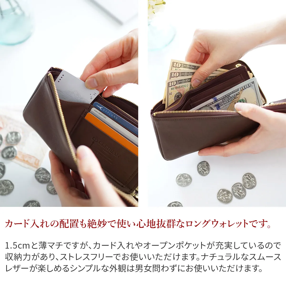 深みのある美しい表情のスムースレザーでつくられたロングウォレットです。 使う程にオリジナルのヴィンテージのような深みも感じられます。程よい光沢のあるゴールドのファスナーが全体を引き締めてくれます。 内部は小銭入れ、両サイドにカード入れとフリーポケットを備えたオーソドックスな作りで使い心地抜群です。 1.5㎝と薄マチなので、小さなバッグやポケットにも収納していただけ、デイリーに活躍します。