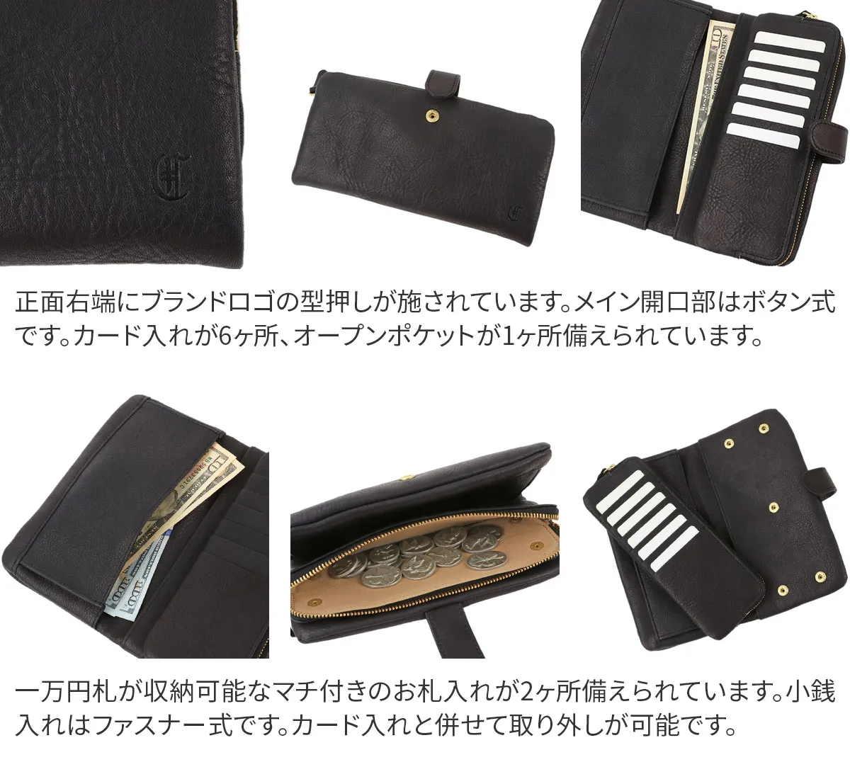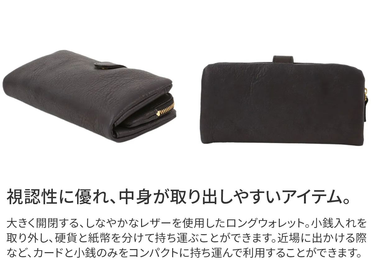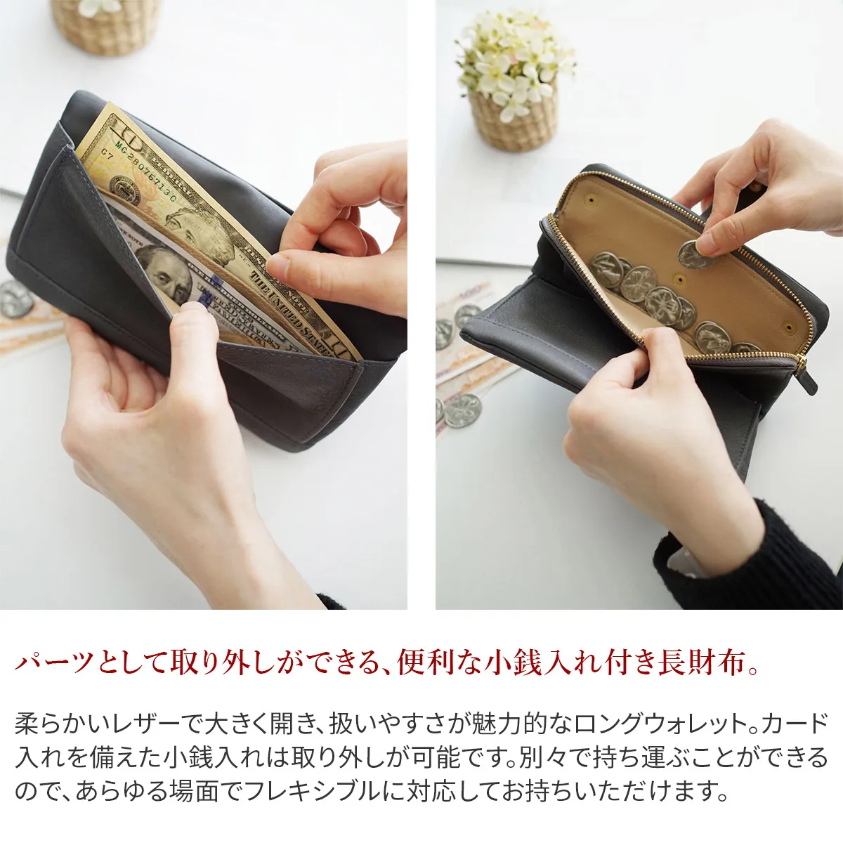 フワッと柔らかなレザーが特徴的なロングウォレット。シンプルなデザインですが、カードと小銭入れの取り外しができます。お出掛けの際、状況に応じて紙幣と硬貨を分けて持ち運ぶことが可能です。内部に通帳も収納できるサイズ感で、使いやすい魅力的なアイテムとなっています。