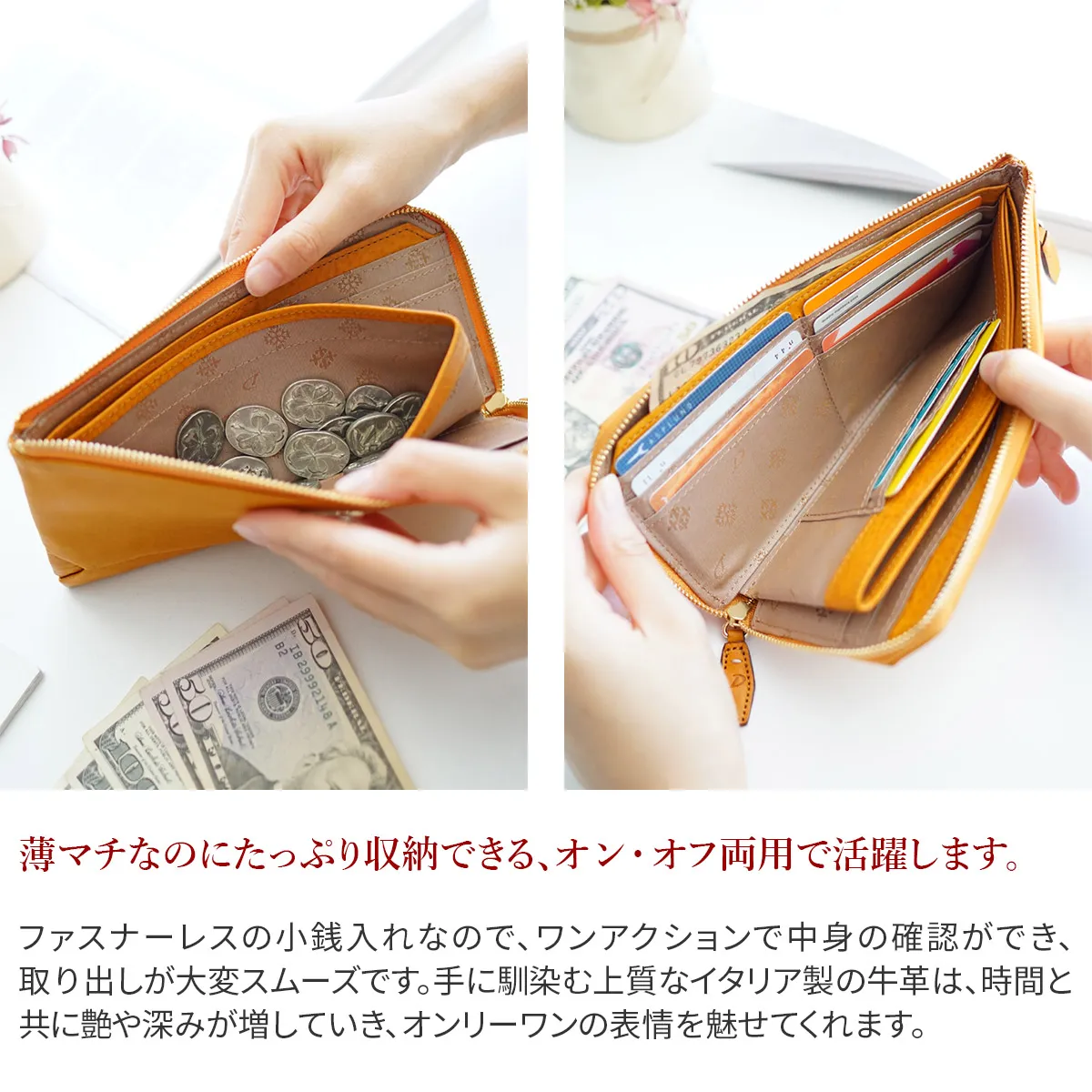 植物タンニン鞣しのイタリアンレザーにパールブローチをあしらいました。 ナチュラルな革の雰囲気に一粒のパールが良く映え、素朴さと清潔感を感じさせます。 エイジングの増すレザーにクラフト調のブローチが相まって、使う程にアンティークの様な趣を感じさせます。 片手でさっと取り出せる薄マチのロングウォレットです。 カード入れやフリーポケットが充実しているので、カードやレシートも分かりやすく分別して収納していただけます。 発色の良いカラーが手元に映え、見ているだけで気持ちが上がります。