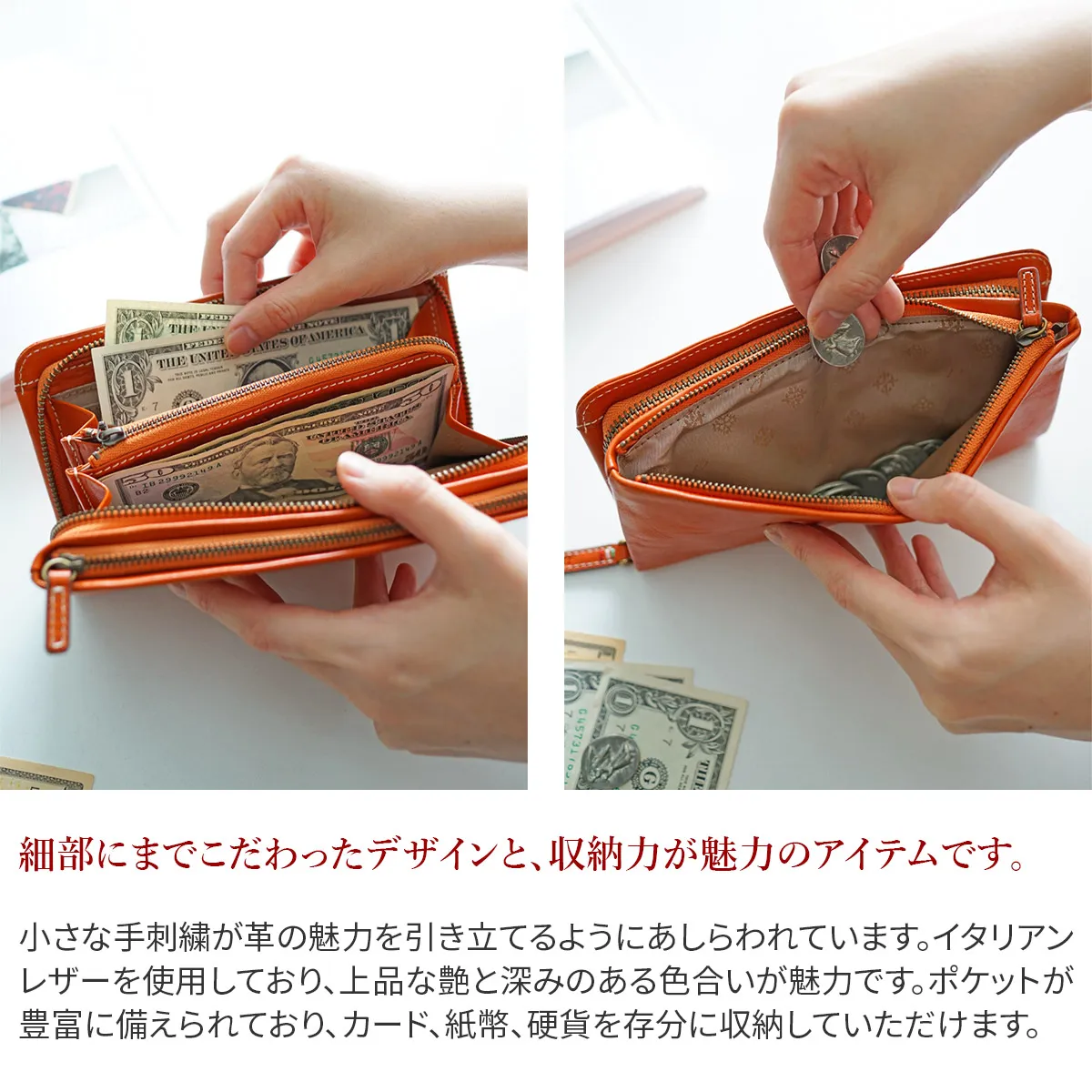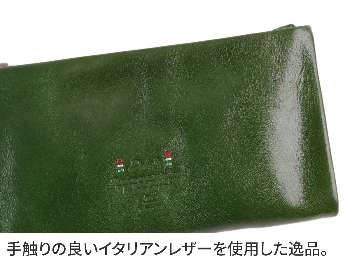 上品な艶と深みのある色合い、イタリアンレザーならではの魅力が溢れます。 引手金具の刻印や、小さな手刺繍など革の魅力が引き立つよう細部にアクセントを効かせたシンプルなシリーズです。 小さな手刺繍が革の魅力を引き立てるようにあしらわれています。イタリアンレザーを使用しており、上品な艶と深みのある色合いが魅力です。ポケットが豊富に備えられており、カード、紙幣、硬貨を存分に収納していただけます。