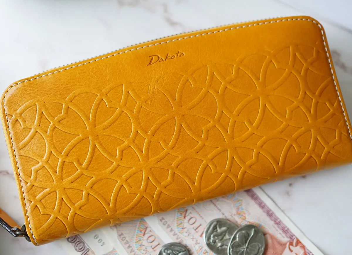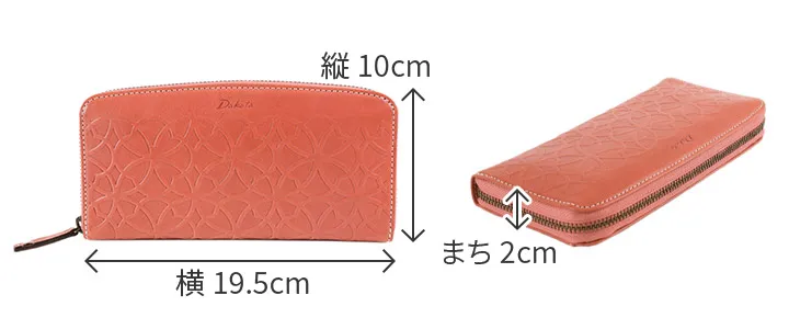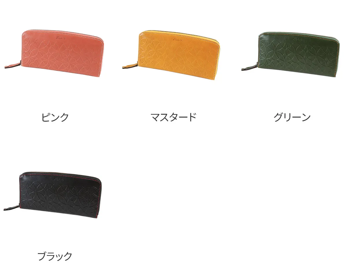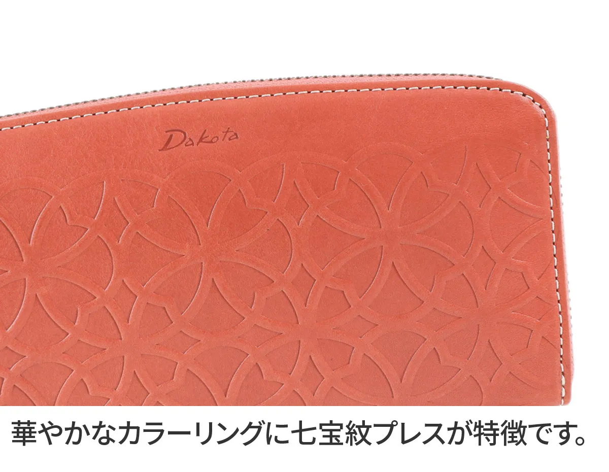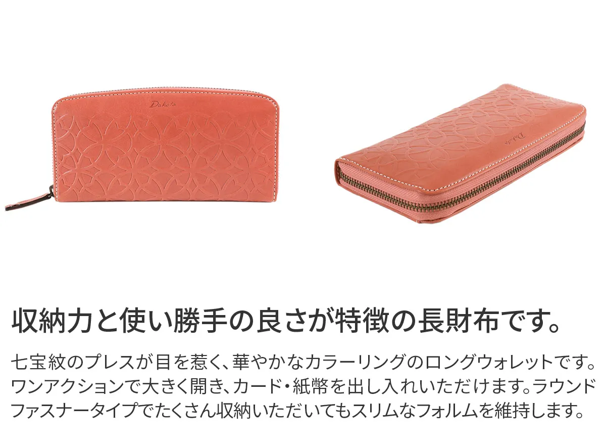 七宝紋と呼ばれる丸柄に花柄を組み合わせた優しい柄ゆきのお財布です。 イタリアンレザーを使用しているのでプレスの焼けが味となり、雰囲気のある仕上がりになっています。七宝紋は円満や調和への願いが込められた縁起の良い柄です。 艶感のあるイタリアンレザーに、七宝紋のプレスが目を惹くデザインに仕上げられています。ラウンドファスナー式で大きく開き、内部を見渡しやすくなっており、普段必要なカードを存分に収納してお持ち歩きいただける大容量タイプです。