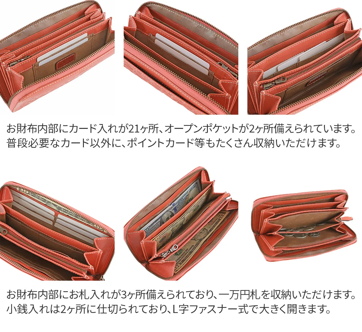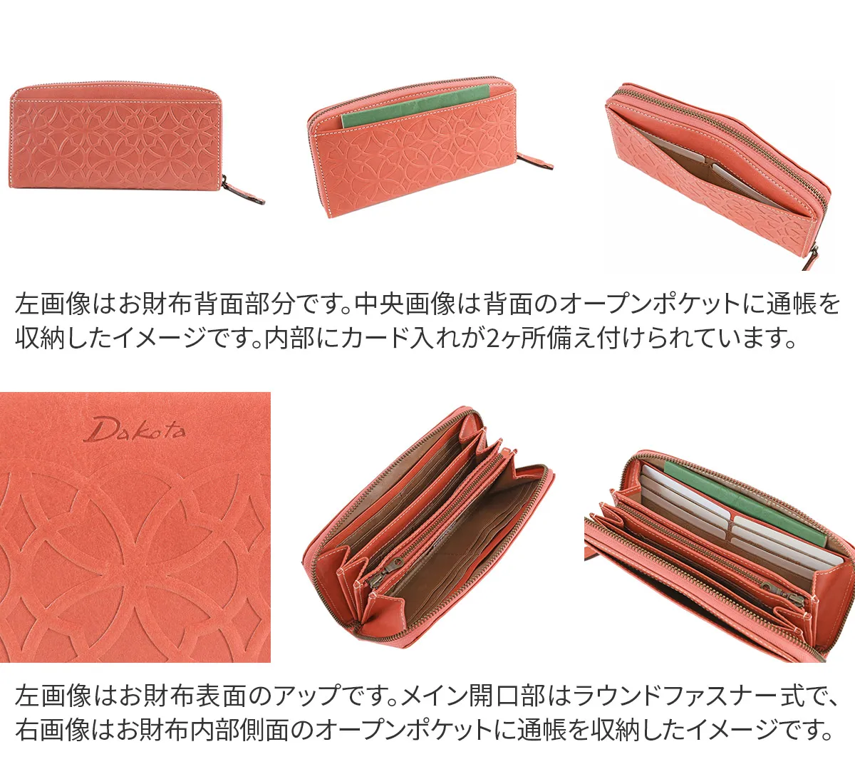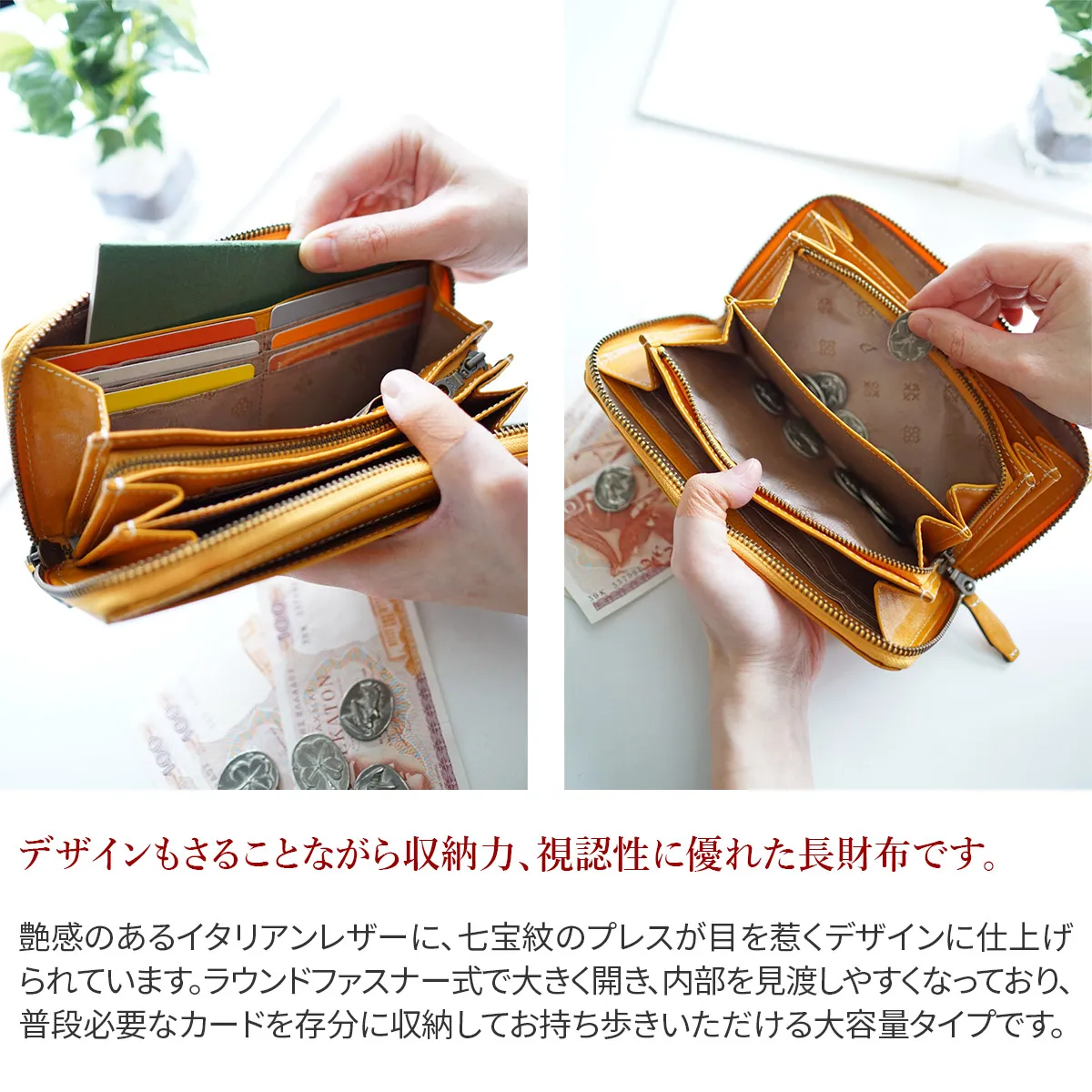 七宝紋と呼ばれる丸柄に花柄を組み合わせた優しい柄ゆきのお財布です。 イタリアンレザーを使用しているのでプレスの焼けが味となり、雰囲気のある仕上がりになっています。七宝紋は円満や調和への願いが込められた縁起の良い柄です。 艶感のあるイタリアンレザーに、七宝紋のプレスが目を惹くデザインに仕上げられています。ラウンドファスナー式で大きく開き、内部を見渡しやすくなっており、普段必要なカードを存分に収納してお持ち歩きいただける大容量タイプです。