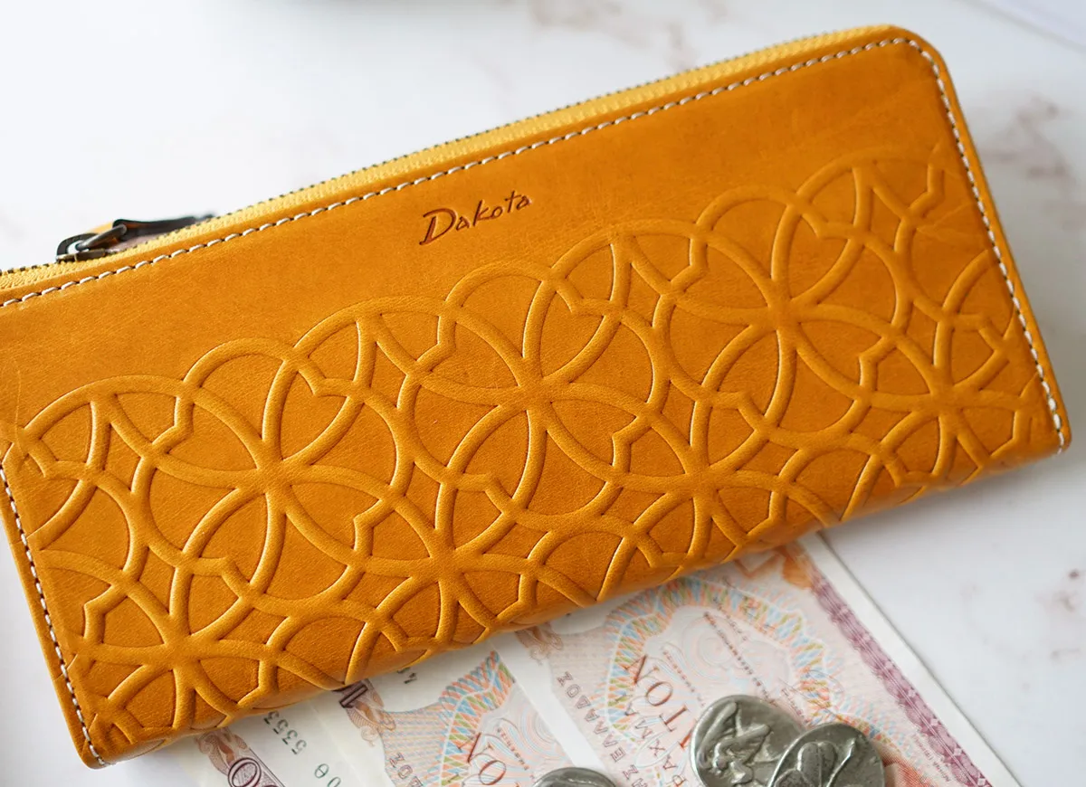 七宝紋と呼ばれる丸柄に花柄を組み合わせた優しい柄ゆきのお財布です。 イタリアンレザーを使用しているのでプレスの焼けが味となり、雰囲気のある仕上がりになっています。七宝紋は円満や調和への願いが込められた縁起の良い柄です。 七宝紋のプレスが目を惹く、L字ファスナータイプのロングウォレットです。上品な色合いも特徴で、女性らしい印象を与えます。薄くスマートなデザインですが、必要なカード、紙幣、硬貨をしっかりと収納いただけるアイテムです。