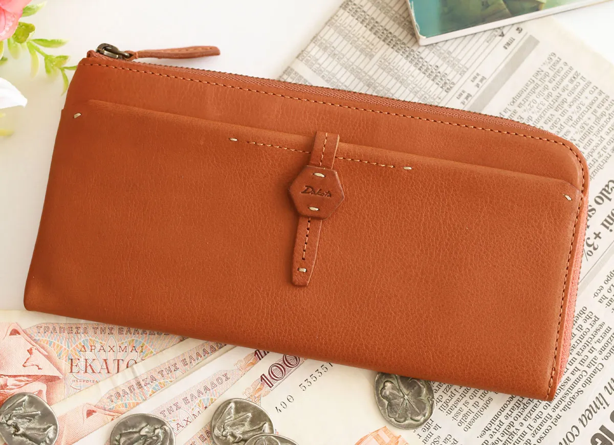 六角形の革のブローチが印象的なイタリアンレザーを使用したシリーズ。 植物タンニン鞣しのレザーを手作業で磨き、ナチュラルな風合いを出しています。 風水で「安定と調和」を意味する六角形をあしらったお守りの様な安心感のあるデザインです。 お財布中央のレザーブローチがデザインのアクセントになっています。手触りの良い柔らかな質感のイタリアンレザーを使用しています。L字ファスナー式で、スリムな見た目ながら、収納力に優れており、使い勝手の良さが魅力です。