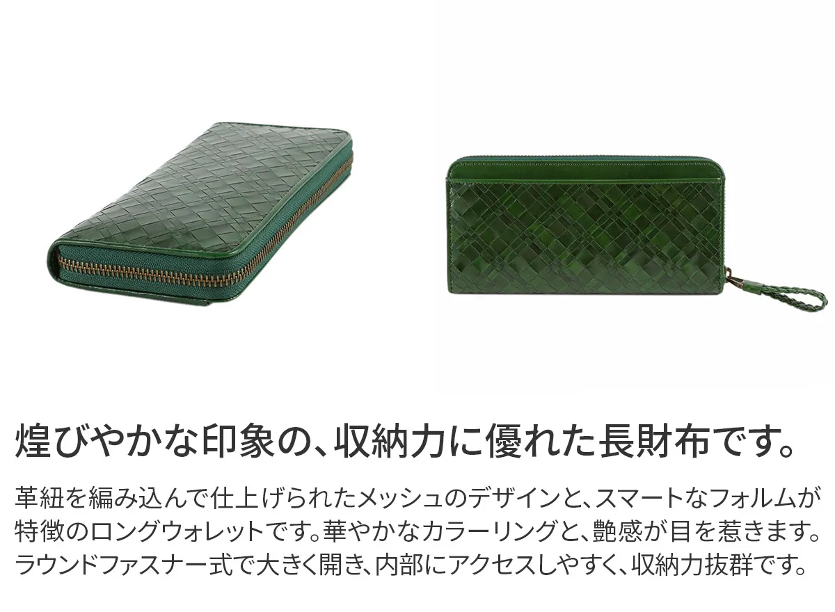 手作業で織られた革メッシュをグレージング加工で艶を上げ、上品に仕上げられています。引手にもヘリを返した2mmの革紐を丁寧に編み込み、手触りの良い形状になっています。細部まで拘りを感じさせるシリーズです。 革メッシュのデザインと華やかな色彩が魅力の逸品です。ラウンドファスナー式で、すっきりとしたフォルムが魅力です。大きく開き、視認性に優れており、抜群の収納力も特徴で、必要なカード・貨幣をたっぷり収納いただけます。