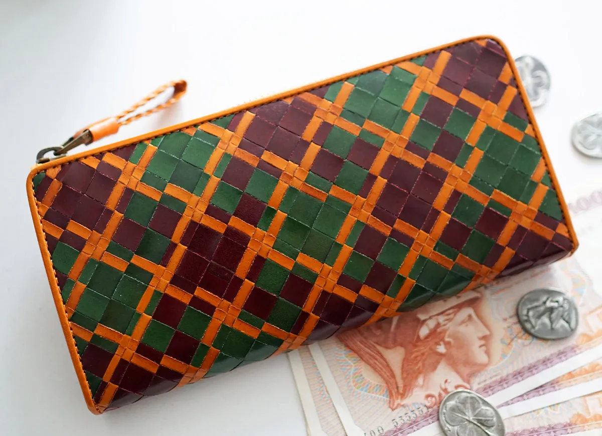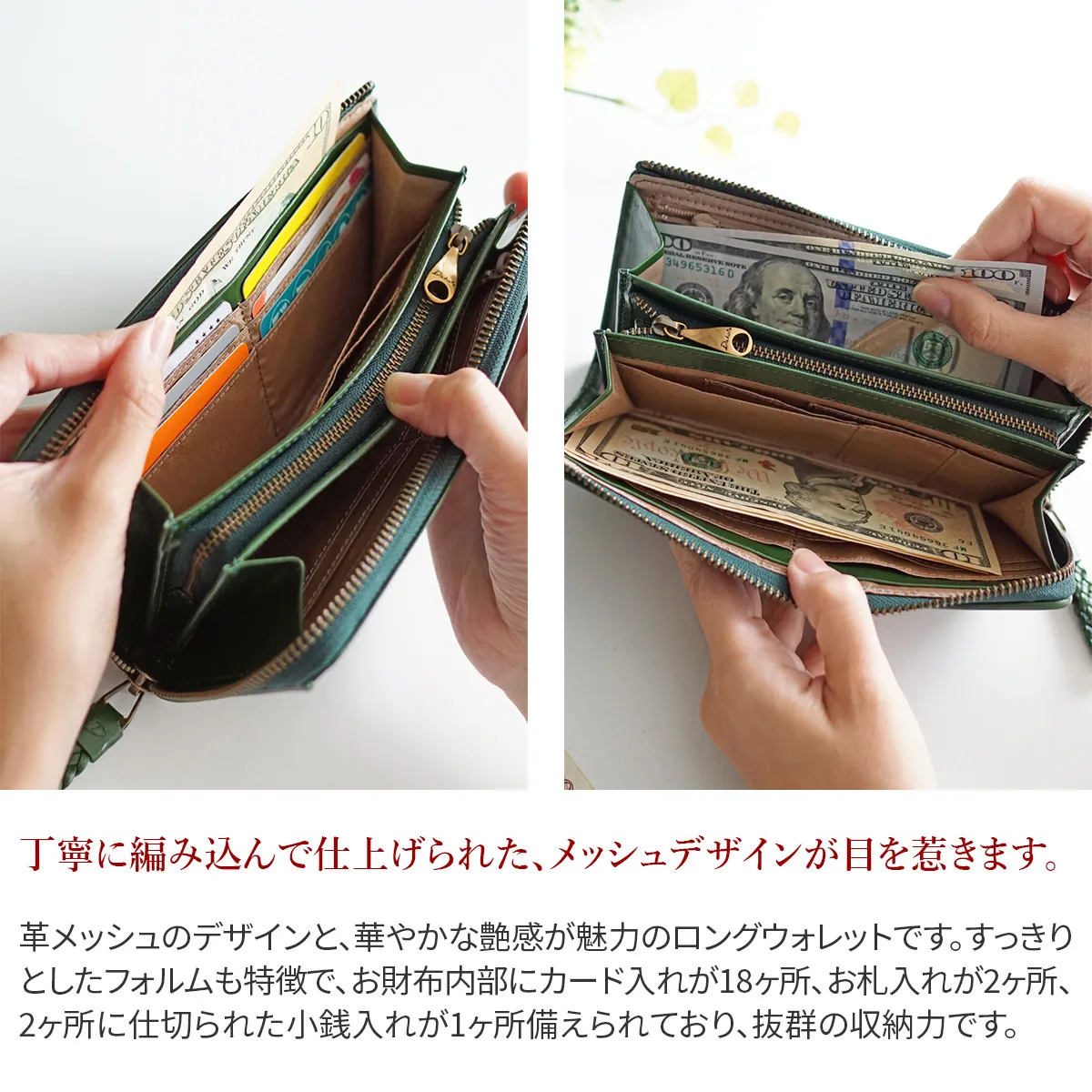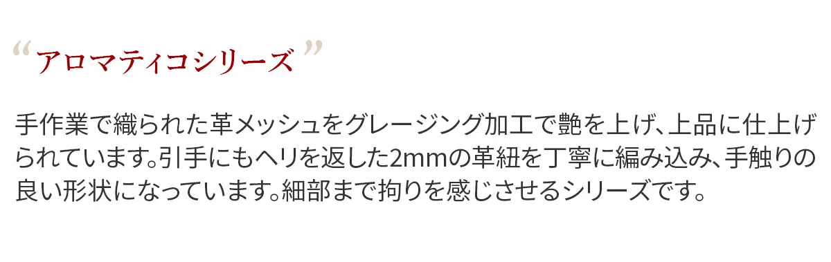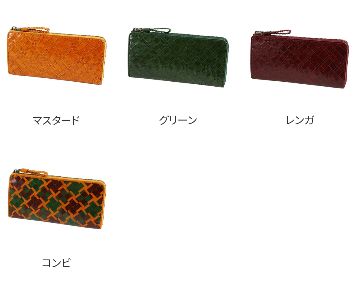 手作業で織られた革メッシュをグレージング加工で艶を上げ、上品に仕上げられています。引手にもヘリを返した2mmの革紐を丁寧に編み込み、手触りの良い形状になっています。細部まで拘りを感じさせるシリーズです。 革メッシュのデザインと、華やかな艶感が魅力のロングウォレットです。すっきりとしたフォルムも特徴で、お財布内部にカード入れが18ヶ所、お札入れが2ヶ所、2ヶ所に仕切られた小銭入れが1ヶ所備えられており、抜群の収納力です。