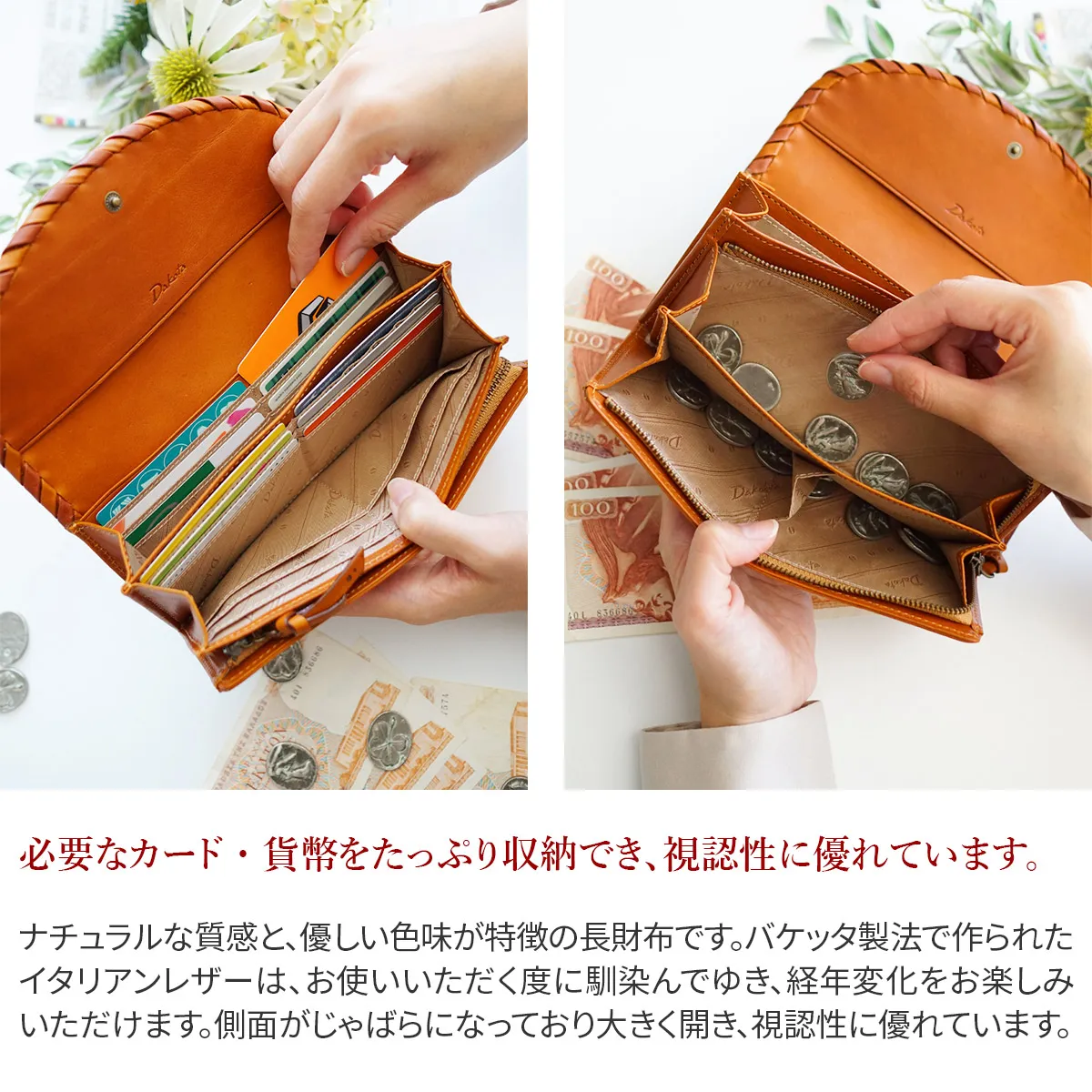 2色のかがりとレーザーカットで刻まれた柄がポイントの女性らしく柔らかな印象のシリーズです。中央にラッキーモチーフである星がさりげなく刻まれています。バケッタ製法で作られたイタリアンレザーを使用し、経年変化も楽しめるシリーズです。 ナチュラルな質感と、優しい色味が特徴の長財布です。バケッタ製法で作られたイタリアンレザーは、お使いいただく度に馴染んでゆき、経年変化をお楽しみいただけます。側面がじゃばらになっており大きく開き、視認性に優れています。