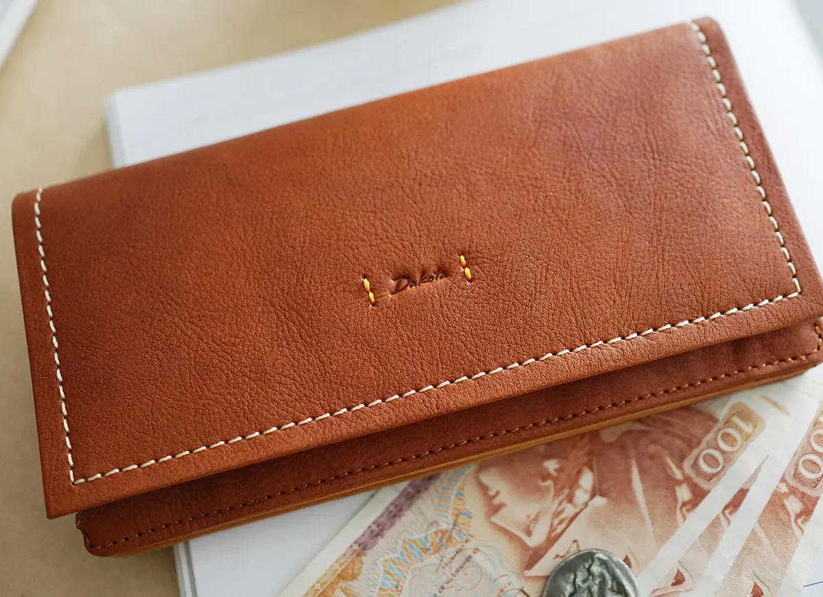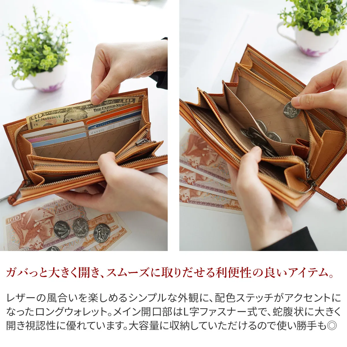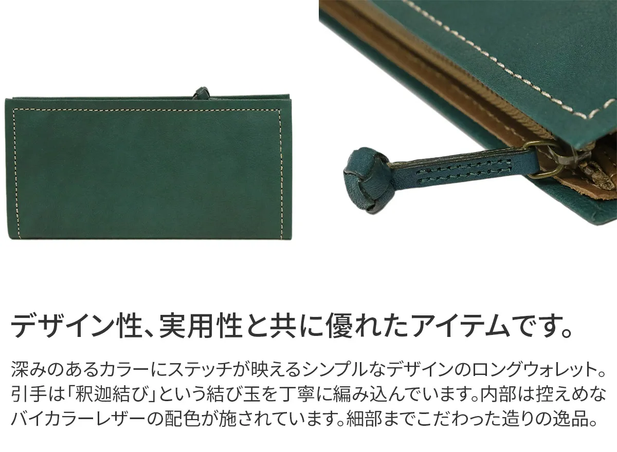 シンプルだけど違いを感じる、そんな見え方にこだわったスッキリした四角いフォルムが印象的なシリーズです。財布の端を大きく折り返し中作りと共に太いステッチで纏める新しい仕立て方をしています。引手は「釈迦結び」という結び玉を時間をかけて編み込み、クラフト感と引きやすさを兼ね備えたアクセントになっています。 カジュアルなクラフト感のあるステッチデザインに、端正なフォルムが上品さをプラスするロングウォレット。豊富な収納力に加え、蛇腹状に大きく開くので視認性が高いのも大きなポイントです。内部に通帳も収納していただけます。