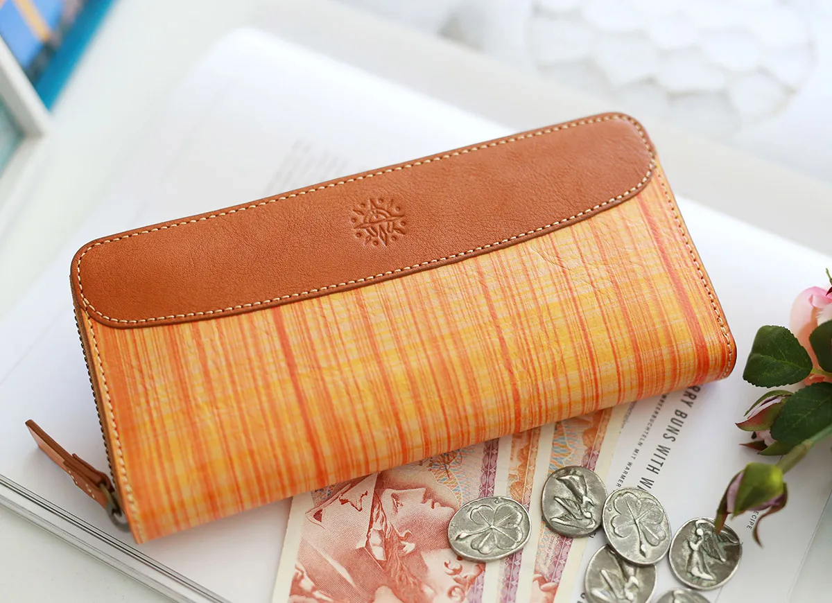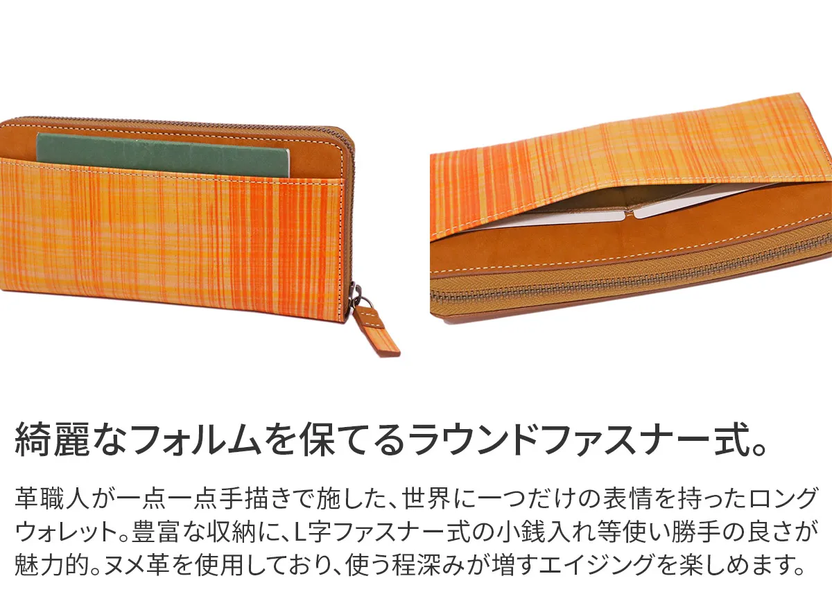 ブラウンのヌメ革とチェック柄の革を組み合わせたアトリエシリーズ。チェック柄は、兵庫県たつの市の革職人が1点1点手描きで施したものです。経年変化が楽しめる植物タンニン鞣し革に唯一無二の柄ゆきが合わさって使うほどに愛着が増すお財布シリーズです。 チェック柄とヌメ革の組み合わせが新鮮なロングウォレット。ポケットとカード入れは、計25ヶ所と豊富に備えられています。小銭入れはL字ファスナー式で取り出しやすく、お札入れは3ヶ所備えられています。ラウンドファスナー式でスリムなフォルムを維持し、大容量に収納していただけます。