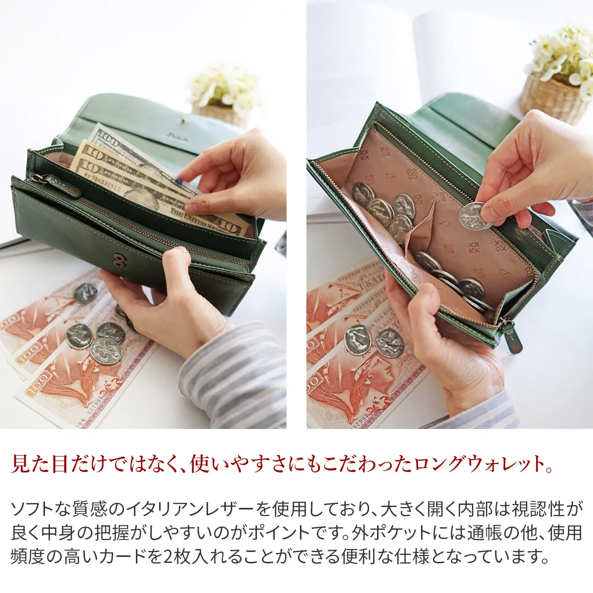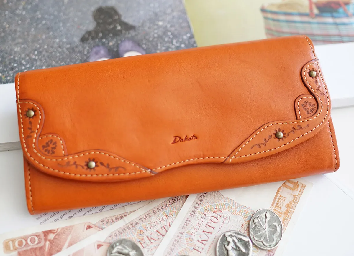 大切なお金をしまうお財布。風水の観点では「財布はお金の家」と考えられ、お金の居心地が良い空間を作ることで金運UPに繋がると言われています。そんな大切な家を守る「門」をイメージして、マーガレットで装飾されたお花の門のデザインを施しました。使うほどに艶や色の深みが増すイタリアンレザーとアンティーク感のある金具がマッチした、クラシカルな雰囲気のお財布シリーズです。 大きなフラップに施されたクラフト感のある、デザインが魅力的です。 内部は大きくマチが備えられた余裕のあるお札入れに、L字ファスナー式の小銭入れなど使い勝手にこだわったロングウォレットです。