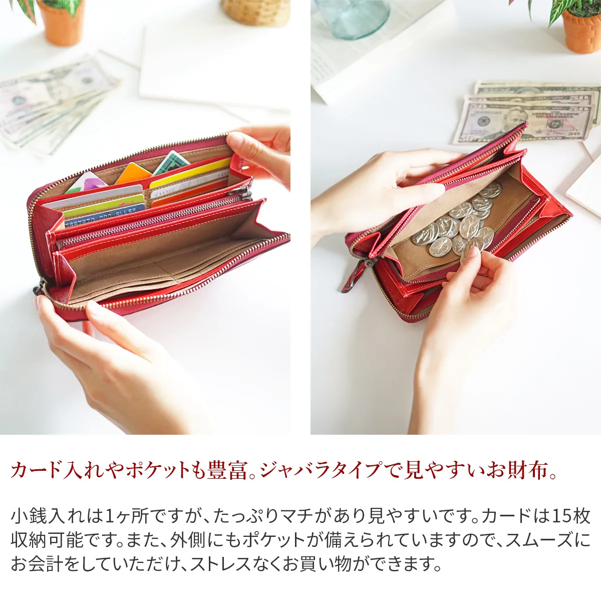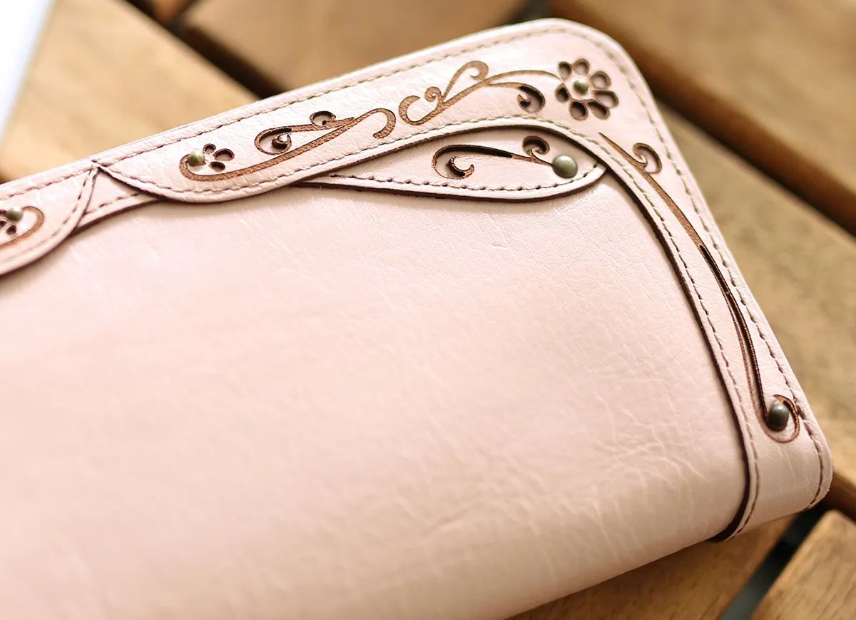 クラシックな額どりに、小花柄をあしらったポエティックなシリーズです。ヌメ革とレザーカットのクラフト感がナチュラル&フェミニンな女性らしさを引き立てます。 おサイフはジャバラタイプで見やすく、カード入れやポケットが豊富に備えられているので機能的です。お花モチーフのデザインが可愛らしい印象を与えてくれています。