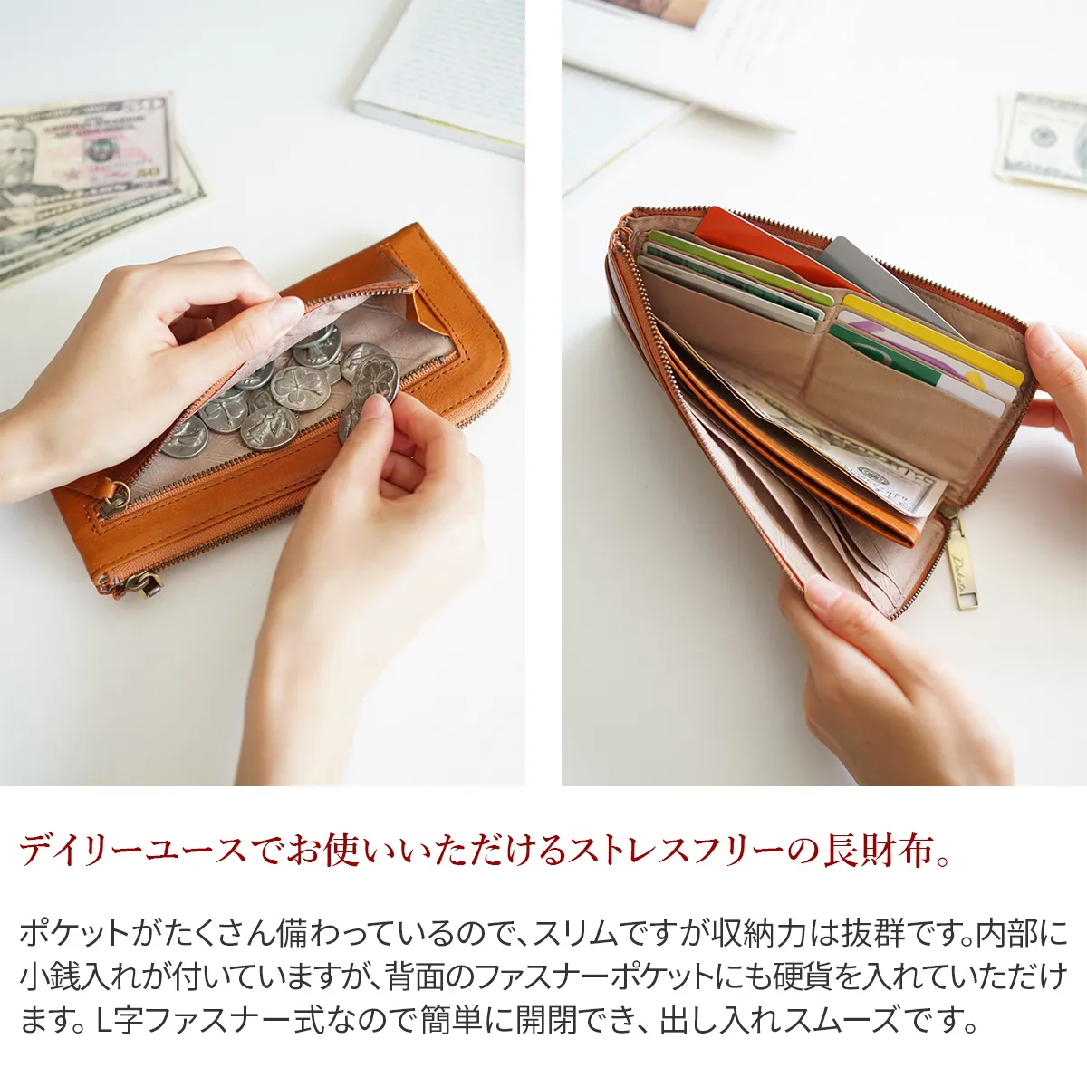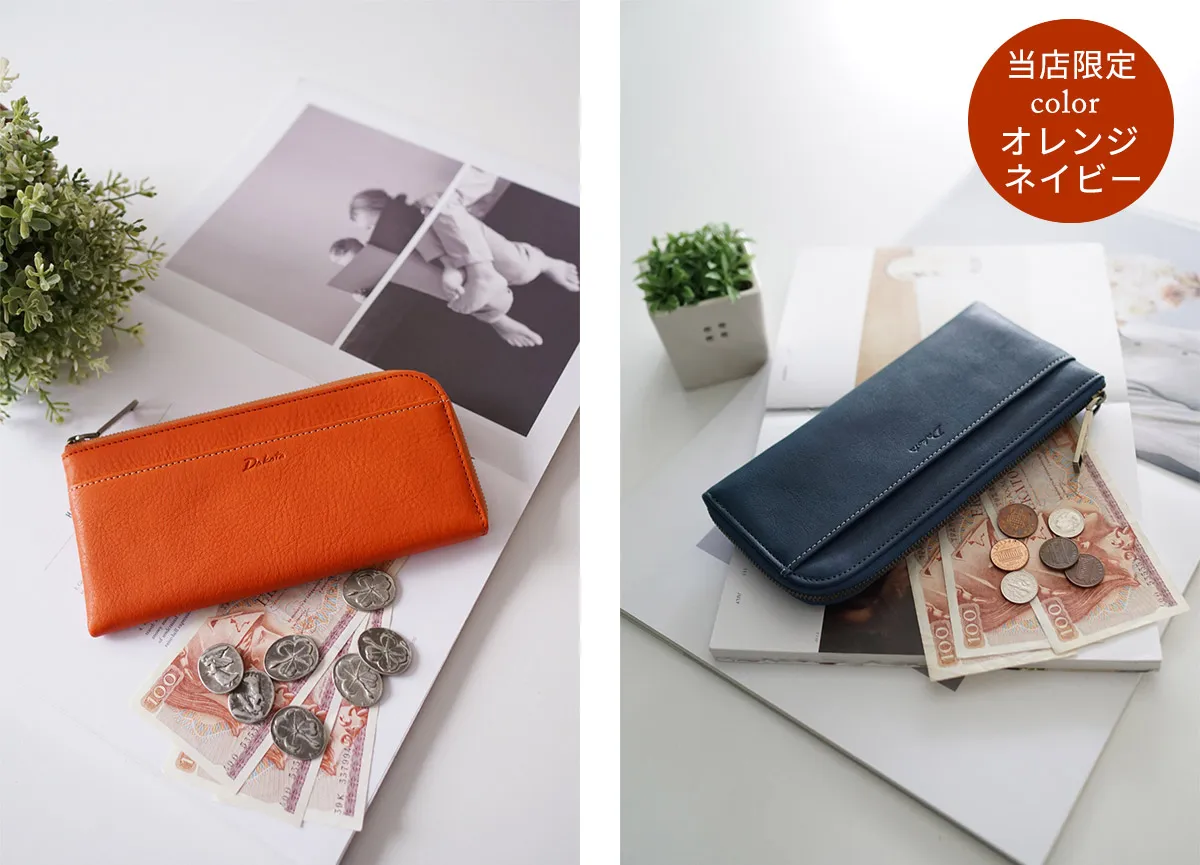 ふっくらとした触り心地の良い革で日本の職人が丁寧に作りました。革本来の味わいを生かすために表はシンプルにまとめています。口金を使ったデザインがどこかレトロで温もりのあるシリーズです。L字ファスナー開閉なので、カードや紙幣をたくさん収納していただいてもすっきりしたフォルムを維持します。