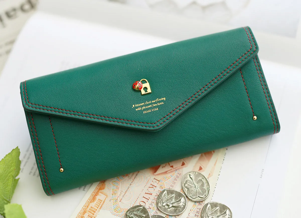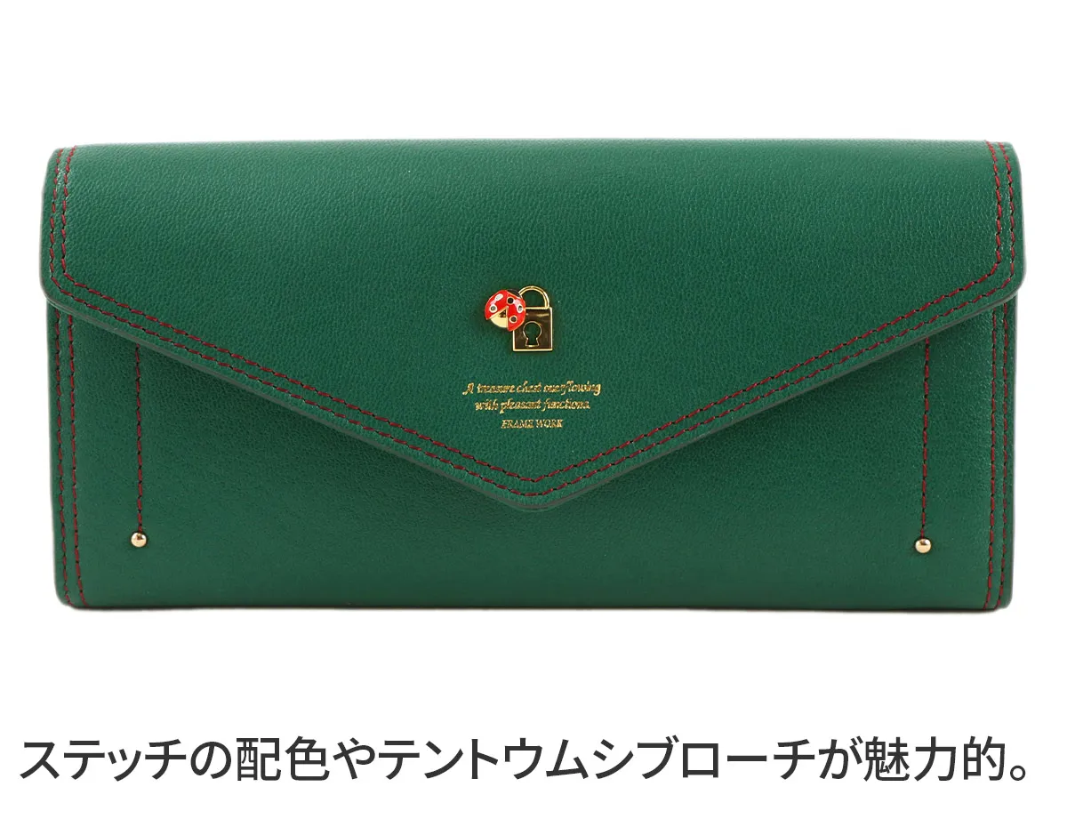 テントウムシ(幸運のシンボル)と大切な物を守る南京錠を掛け合わせた、オリジナル開運ブローチがポイント。 内装には金運アップに効果的なドット柄の裏地やゴールドの箔革を取り入れました。 持ち主に幸運が訪れるよう、願いを込めたお財布です。 外観はキラリと光るブローチとステッチの配色が愛らしく、内部は裏地の水玉デザインが一面に広がります。 上質なレザーでしなやかさと高級感を引き立てます。