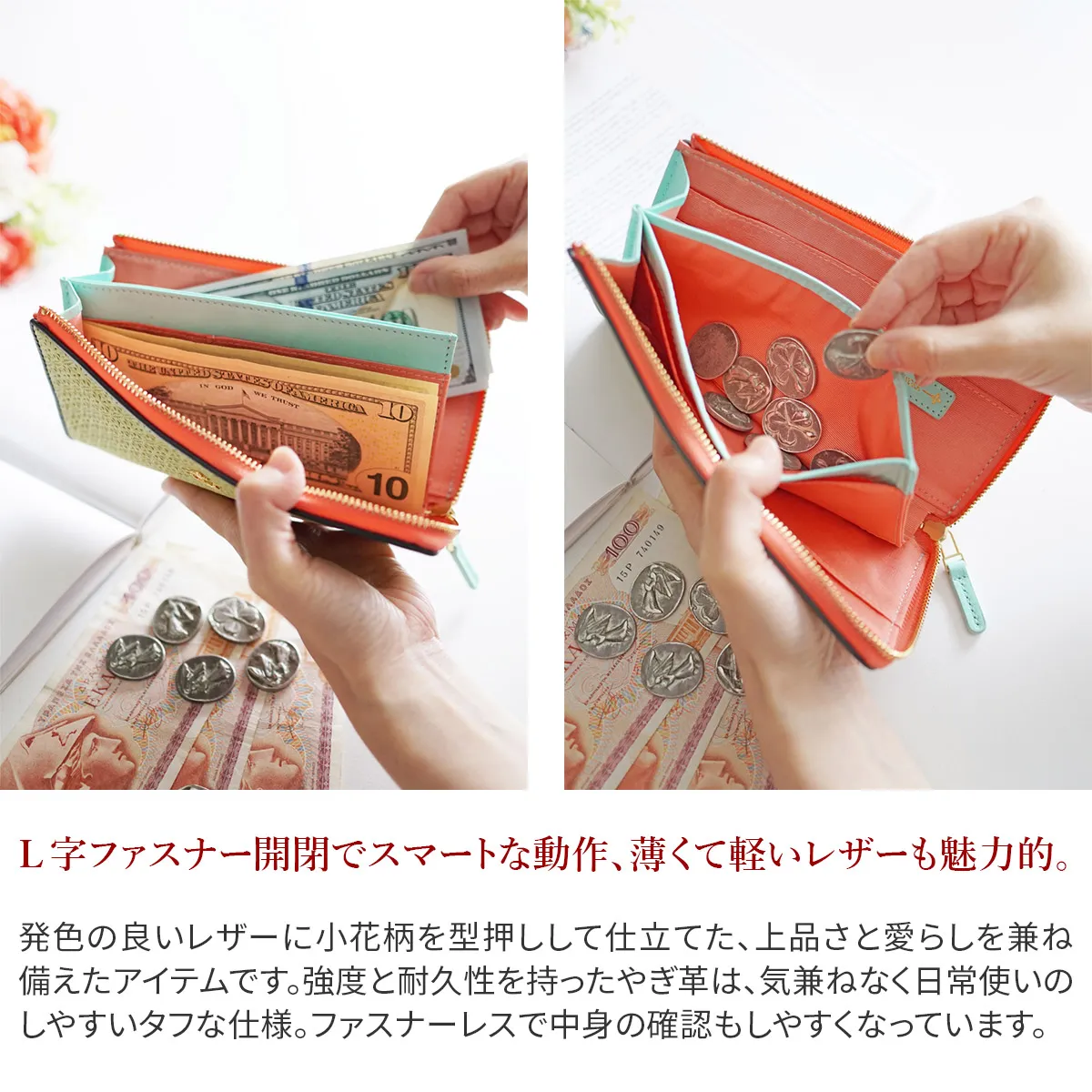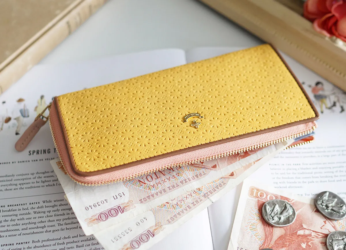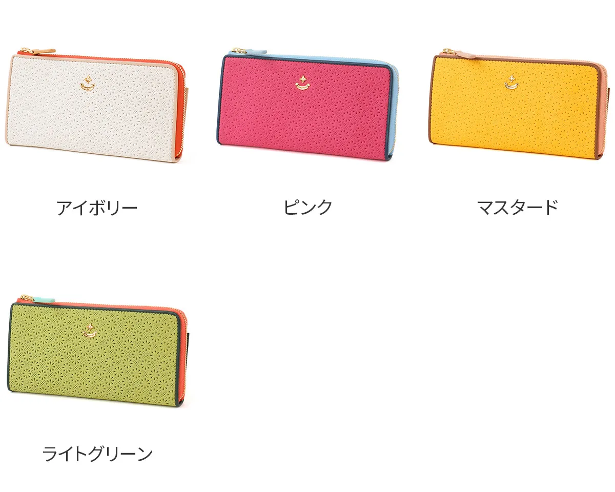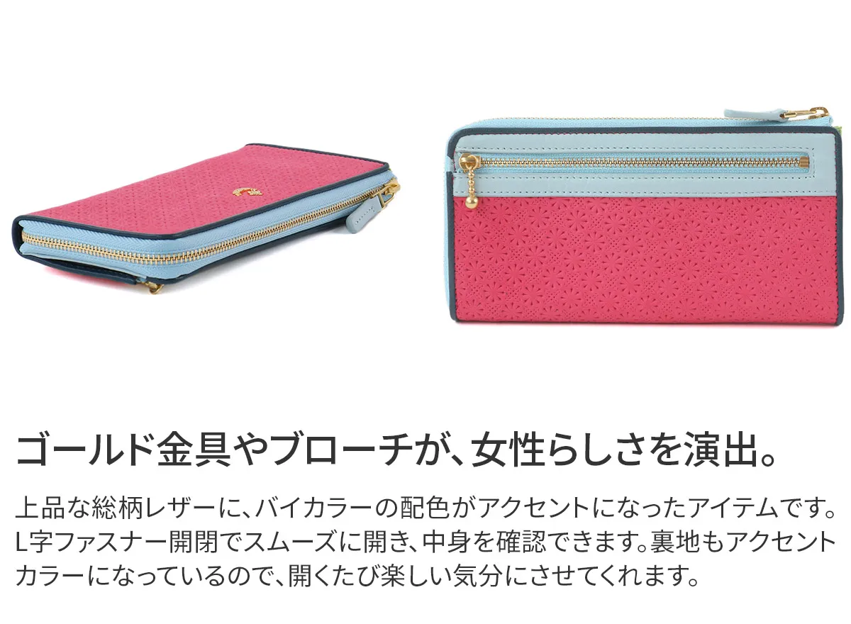 砂糖菓子のような可愛らしい小花柄をやぎ革に型押ししました。やぎ革の薄く軽い特徴を活かして軽量に仕立てられています。 艶を抑えたマット調のレザーに、小花柄の総柄が際立ち手元を華やかに演出してくれます。L字ファスナー式は、すべりがよくスムースな開閉が可能です。最低限の動作で貨幣やカードを取り出すことができます。
