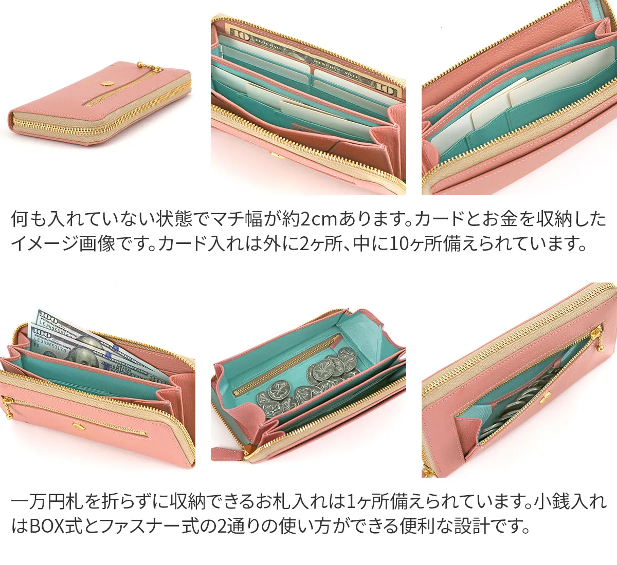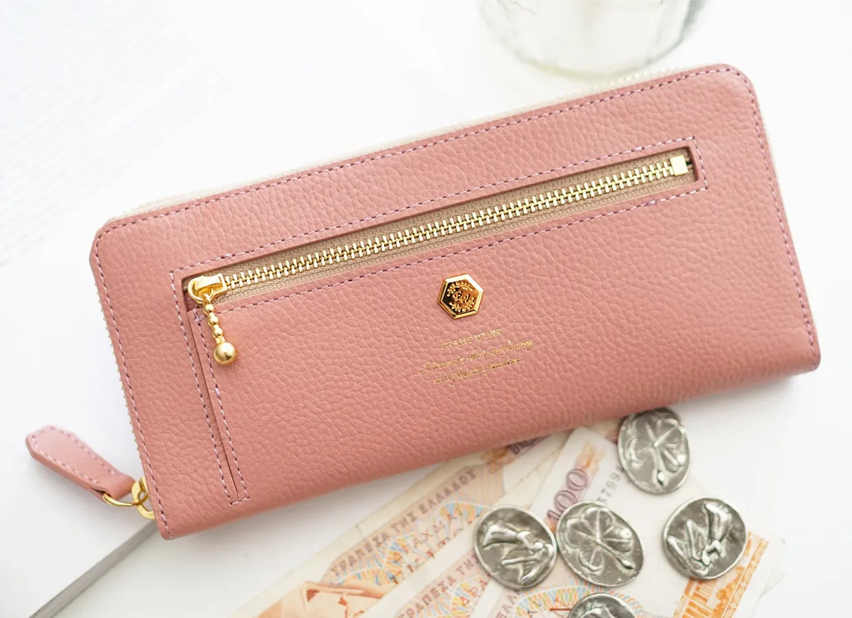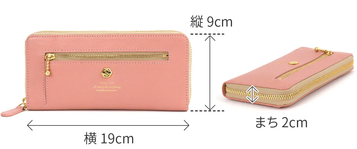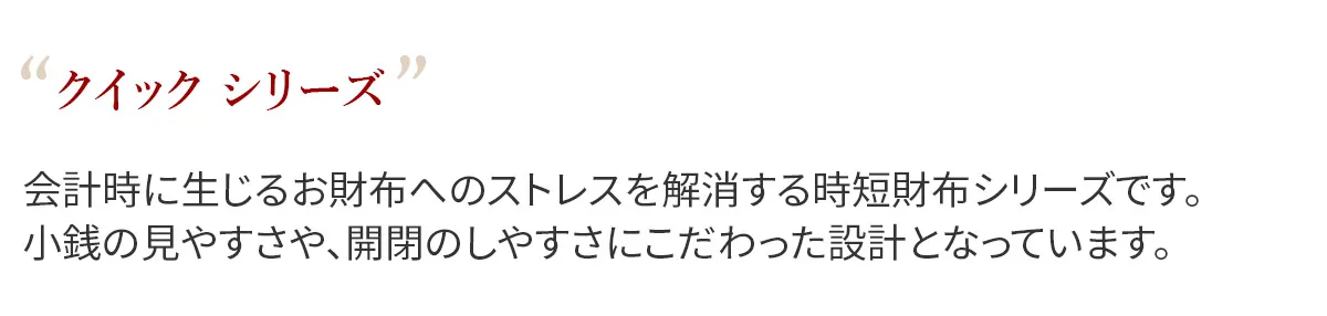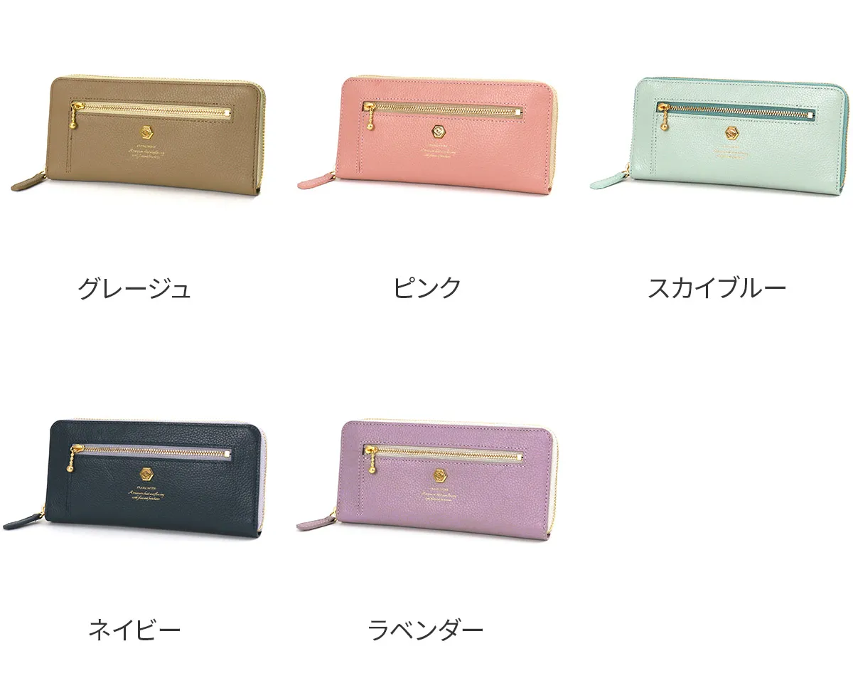 会計時に生じるお財布へのストレスを解消する時短財布シリーズです。小銭の見やすさや、開閉のしやすさにこだわった設計となっています。 柔らかなカラーにゴールドのあしらいが繊細に施されており、上品なデザインの長財布です。2通りのアクセスから小銭を取り出せる特徴的な設計となっています。豊富なカード入れも備えられおり収納に困らず、ラウンドファスナーですっきり持つことができます。