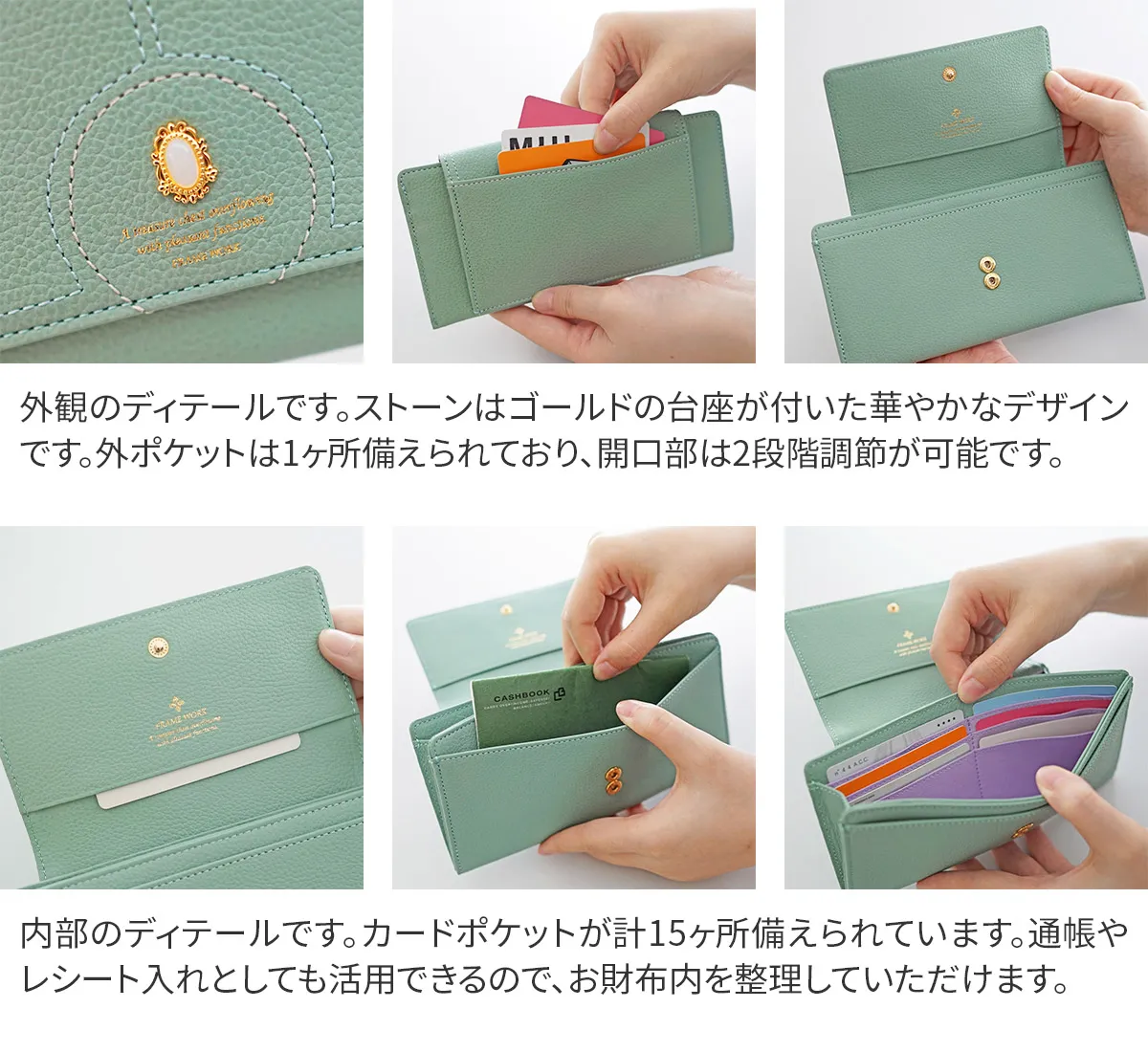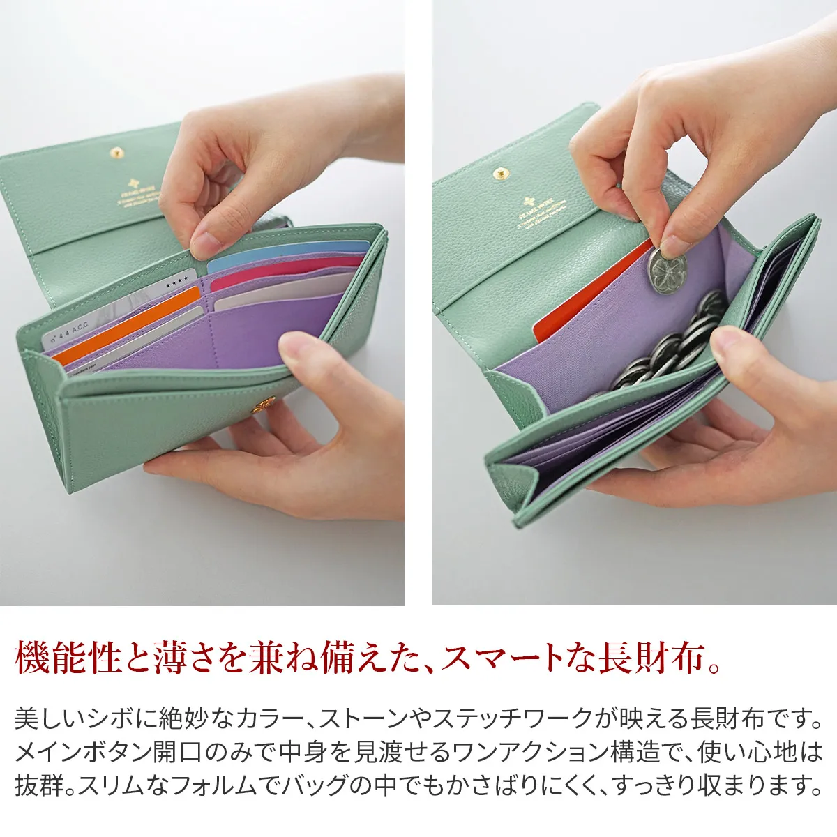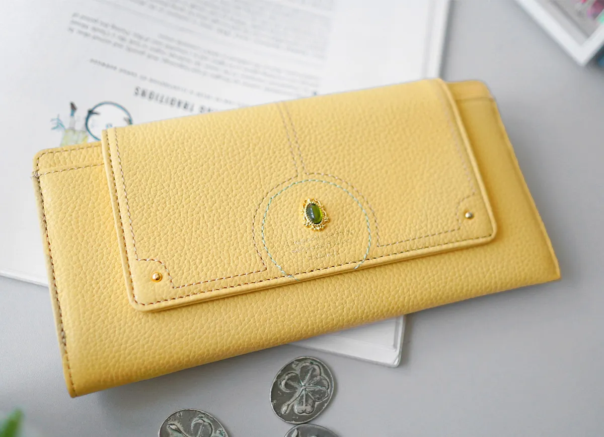 煌めくレザーに、パワーストーンをあしらったシリーズ。ガラスから生まれた鮮やかなストーンは周囲に漂う力を柔らかく変換し、持つ人に優しく寄り添います。色に込めた意味とともに、大人の女性の日常に活力を。 パワーストーンが目を惹くデザイン性に優れた長財布は、開くと中まで鮮やかな配色です。内部は一目で中身を確認できるファスナーレス仕様です。カードやお金、通帳やレシート類をしっかり収納できる優れた収納力に加え、薄型でバッグにすっきり収まるスマートな持ち心地です。