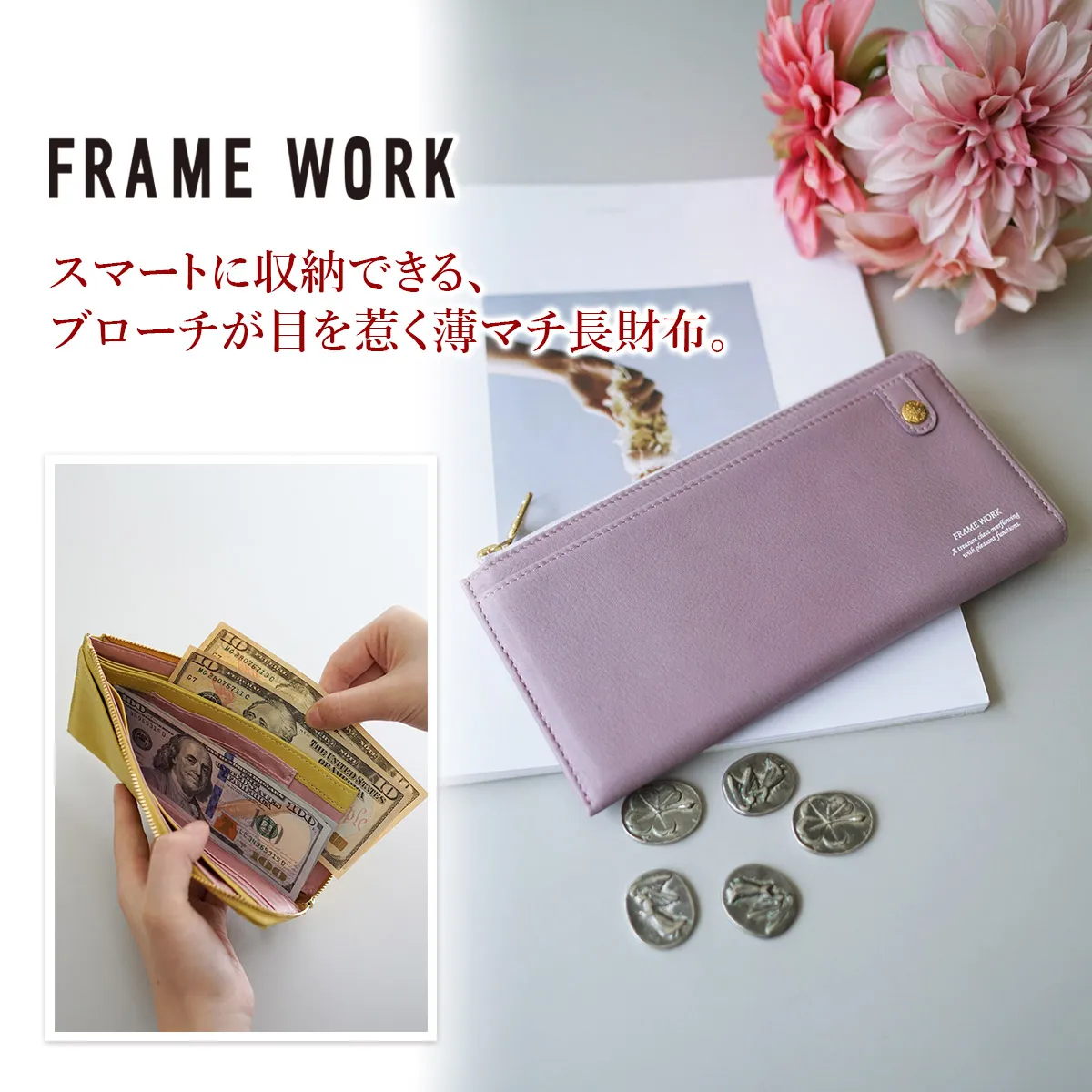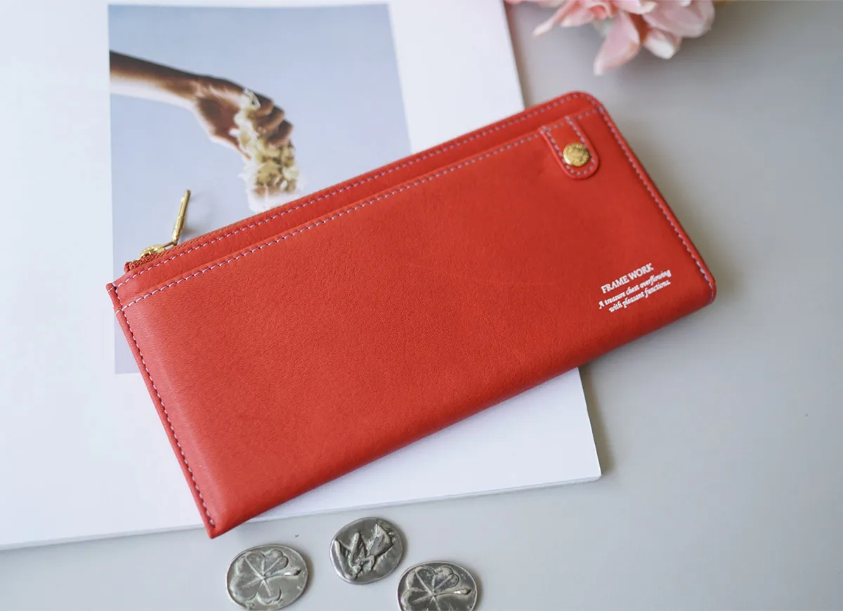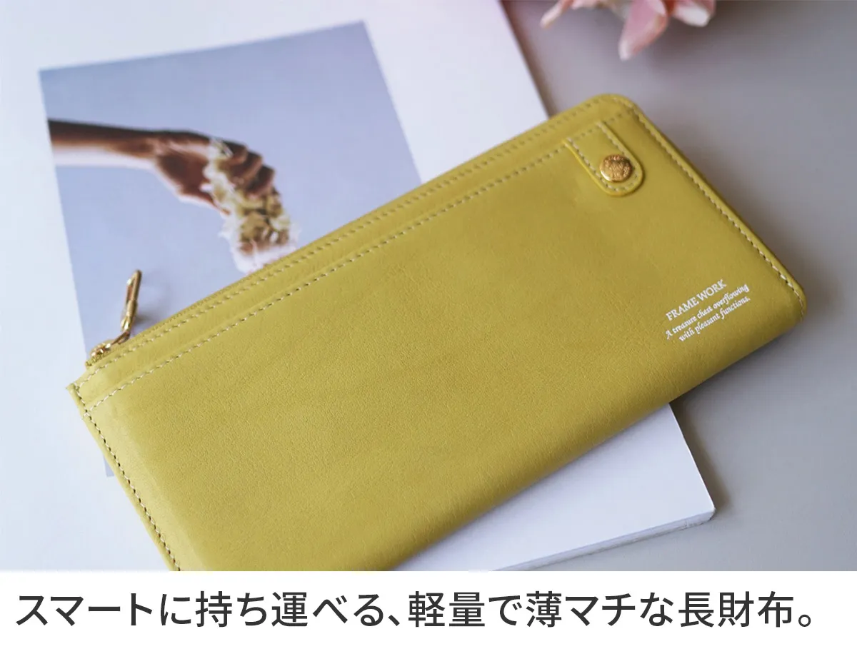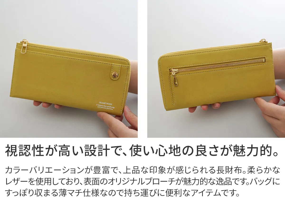 美しくスマートに持てる、極薄設計のエレガントウォレット。 柔らかなレザーに施されたオリジナルブローチと豊富なカラーバリエーションで洗練された大人の手元を演出します。 手に馴染む滑らかなレザーを使用した上品な印象が感じられる長財布。 L字ファスナー式で、視認性が高く必要なものを取り出しやすいのがポイントです。 柔らかなカラー展開となっており、手元を華やかにしてくれる使い心地の良い逸品です。