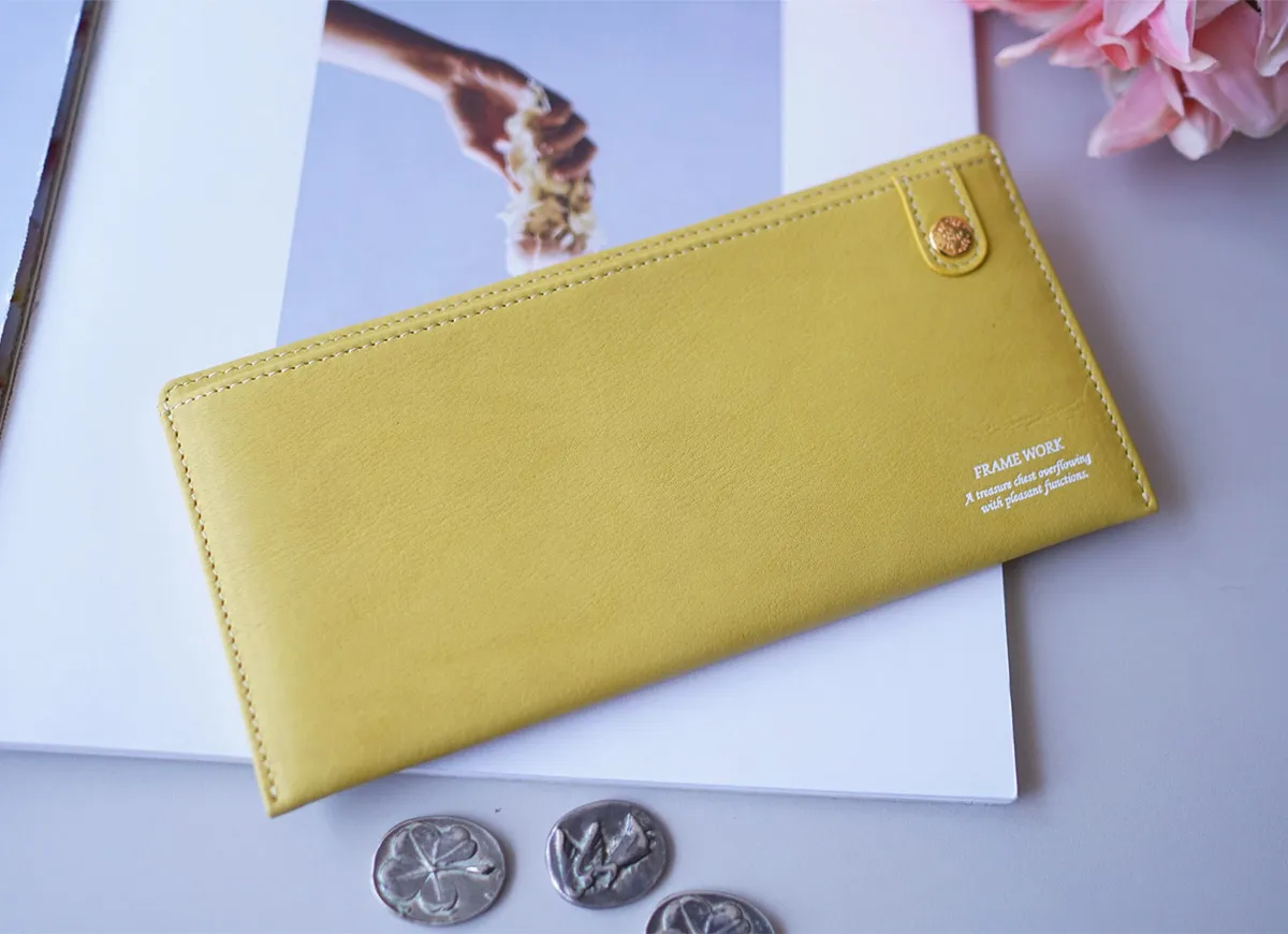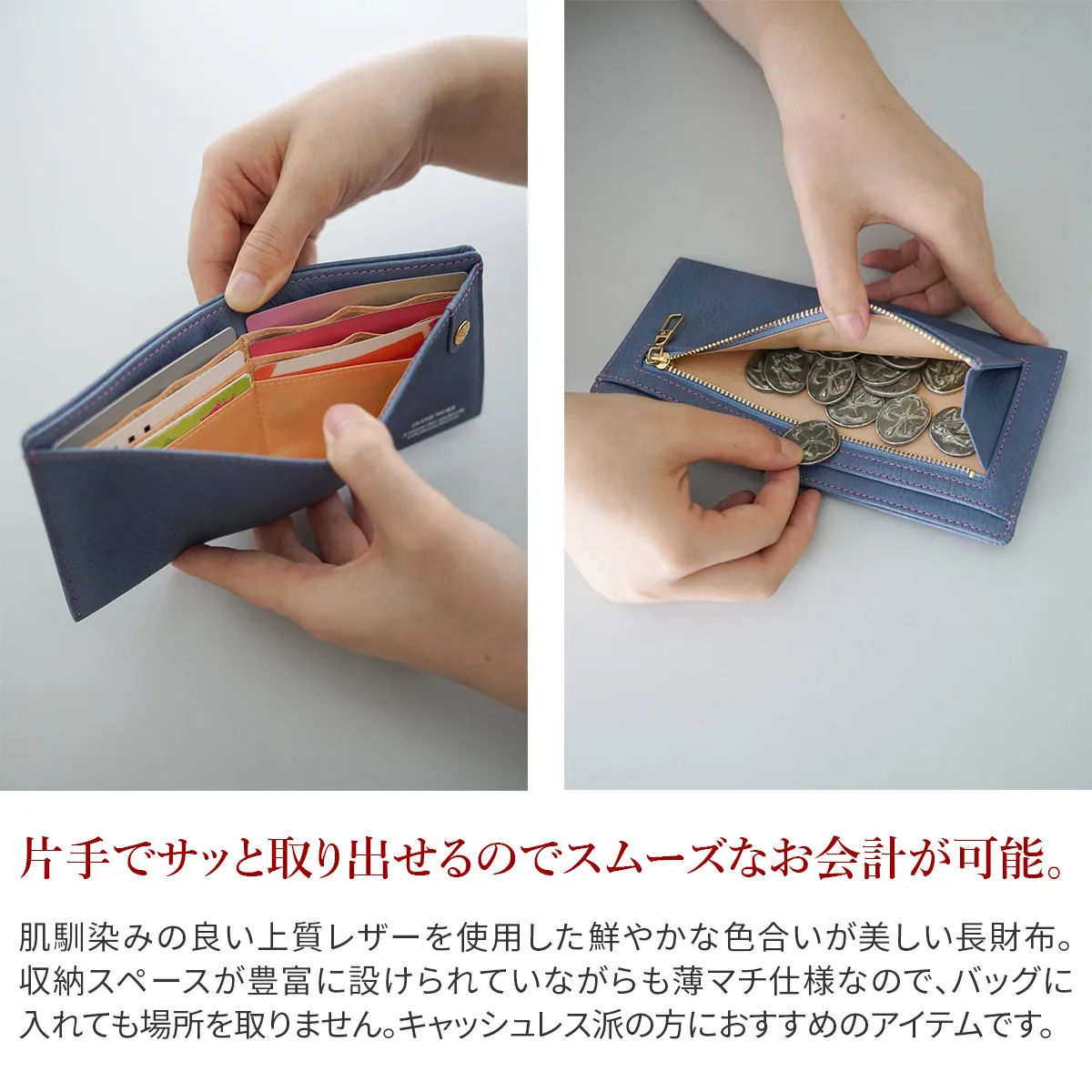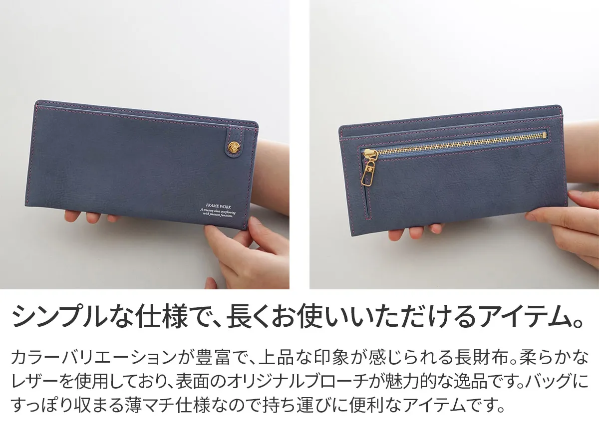 美しくスマートに持てる、極薄設計のエレガントウォレット。 柔らかなレザーに施されたオリジナルブローチと豊富なカラーバリエーションで洗練された大人の手元を演出します。 手に馴染む滑らかなレザーを使用した上品な印象が感じられる長財布。 開口部がオープン仕様で取り出しやすく、薄マチなのでスマートにお持ちいただけます。 柔らかなカラー展開となっており、手元を華やかにしてくれる使い心地の良い逸品です。