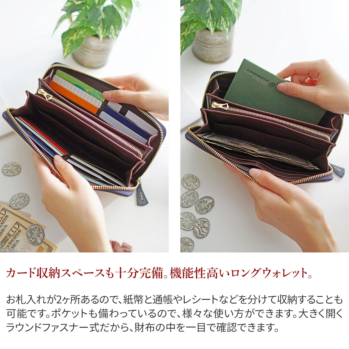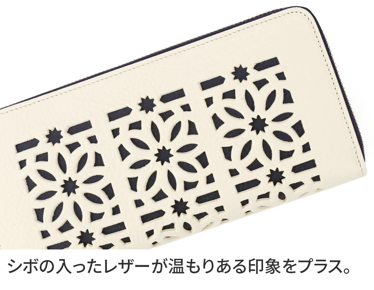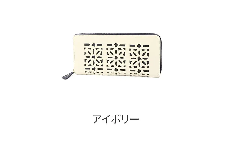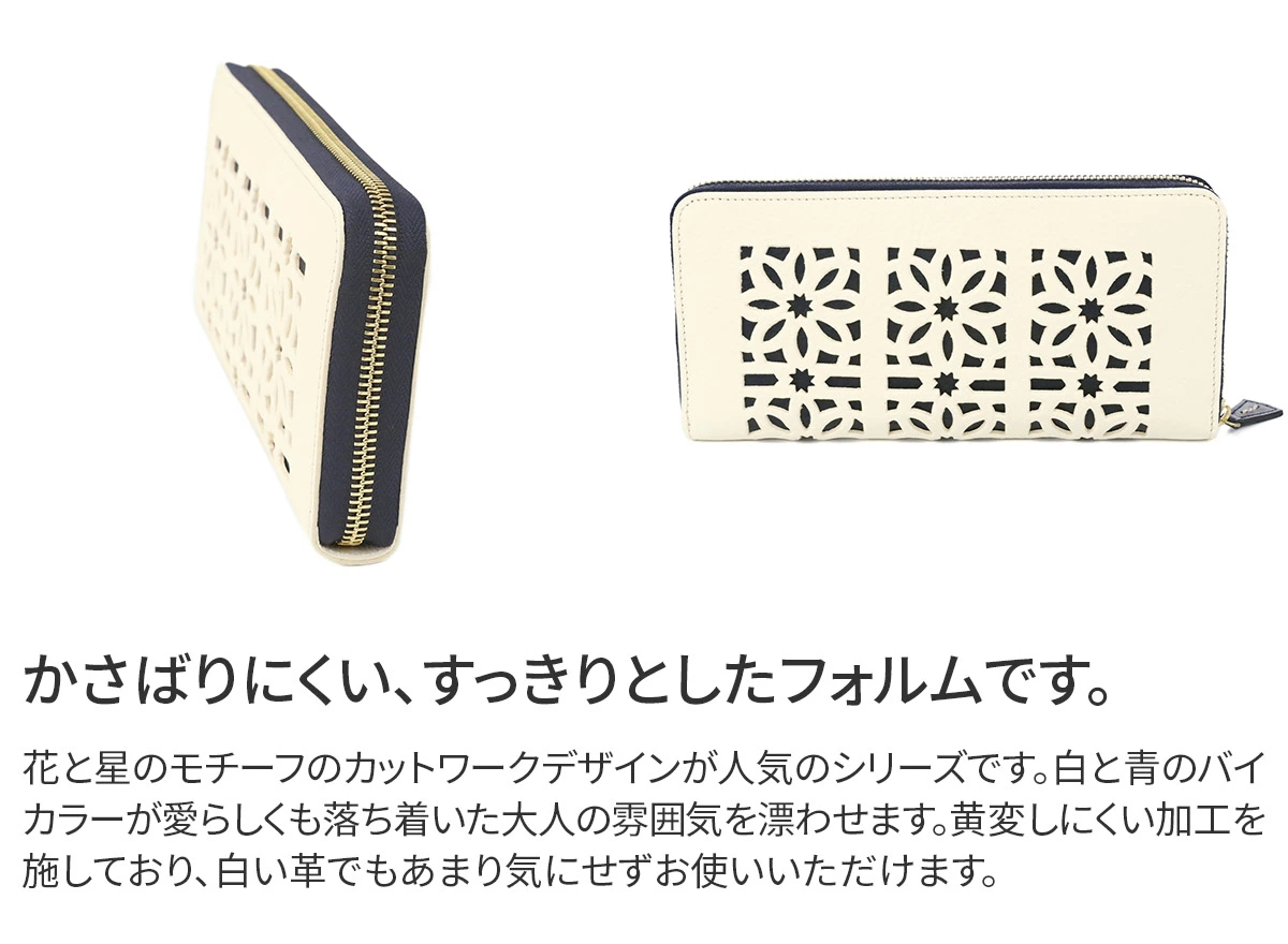 イタリア産のオイルを十分に含んだ牛革を使用したシリーズで、表面に大胆なカットワークがあしらわれています。カットワークのモチーフは、地中海地方沿岸に見られる伝統的な風窓からイメージされており、花と星を表しています。 シボのある革を使用しており、優しい印象を与えます。かさばりにくく、すっきりとしたシルエットを保つラウンドタイプの長財布です。大きく開くので中が見やすく、お会計をスムーズに済ませることができます。