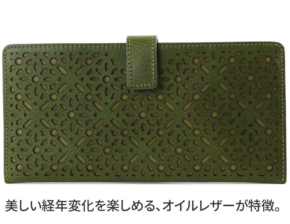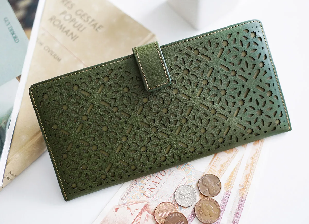 広がる花模様。その連続模様は、その整然とした美しさが魅力のシリーズ。genten定番の花模様「カットワーク」を極小にダイヤ型に散りばめた、ダイヤカットワーク。使用する素材は、定番のイタリア、バダラッシカルロ社のミネルヴァボックス。より繊細に仕上げた小さな多面体の透かし模様は、革表面の地シボと合わさり、より複雑に表情豊かに映し出してくれます。 ブラウン・・・・艶が上がり、赤みが増してゆきます。 フォレストグリーン・・・・艶が上がり、冴えた緑みが落ち着き、濃くなってゆきます。 ミネルヴァボックスの上質なレザーを贅沢に使用したアイテムです。薄型ですが8ヶ所のカード入れ、2ヶ所のお札入れ、1カ所の小銭入れを完備しています。かさばらず身軽に、スマートに持ち運びができます。また、使う程に自然本来の風合い豊かなシボに色艶が増し、しなやかに変化していく様子をお楽しみいただけます。