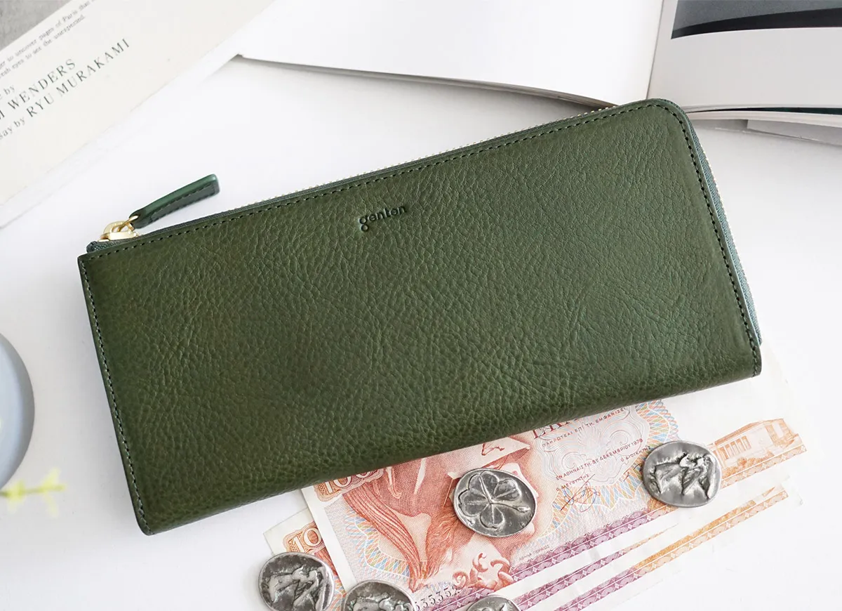 シンプルな中にも漂う知的な佇まいと、数々の手仕事に裏打ちされた確かな品格と最良質なヴァケッタレザー。 カジュアルで重くなりがちな minerva box を使用していますが、仕様などによりできるかぎりの軽量化を図っています。クールでユニセックスでも持てるようなデザインです。 水染みになりやすいので、急な水漏れの際は素早く布などで拭き、風通しの良い日陰でゆっくり乾燥させて下さい。 多少の爪傷は柔らかい綿の布で爪傷の方向に合わせて拭くとある程度だったら取れます。深い傷の場合は取れません。 タンニン鞣しの特性上、日焼け、経年変化が多くみられますが、それも味としてお楽しみください。 内装は、よりすっきりと見えるようピット鞣しのインドのカーフを使用しています。 上質な牛革に、深みのある上品な色合いが高級感をさらに引き立てます。L字ファスナーを開けると、ワンアクションで内部へアクセスできる便利の良さで、手元の所作まで美しく演出。豊富な収納スペースで賢く整理整頓ができるアイテムです。