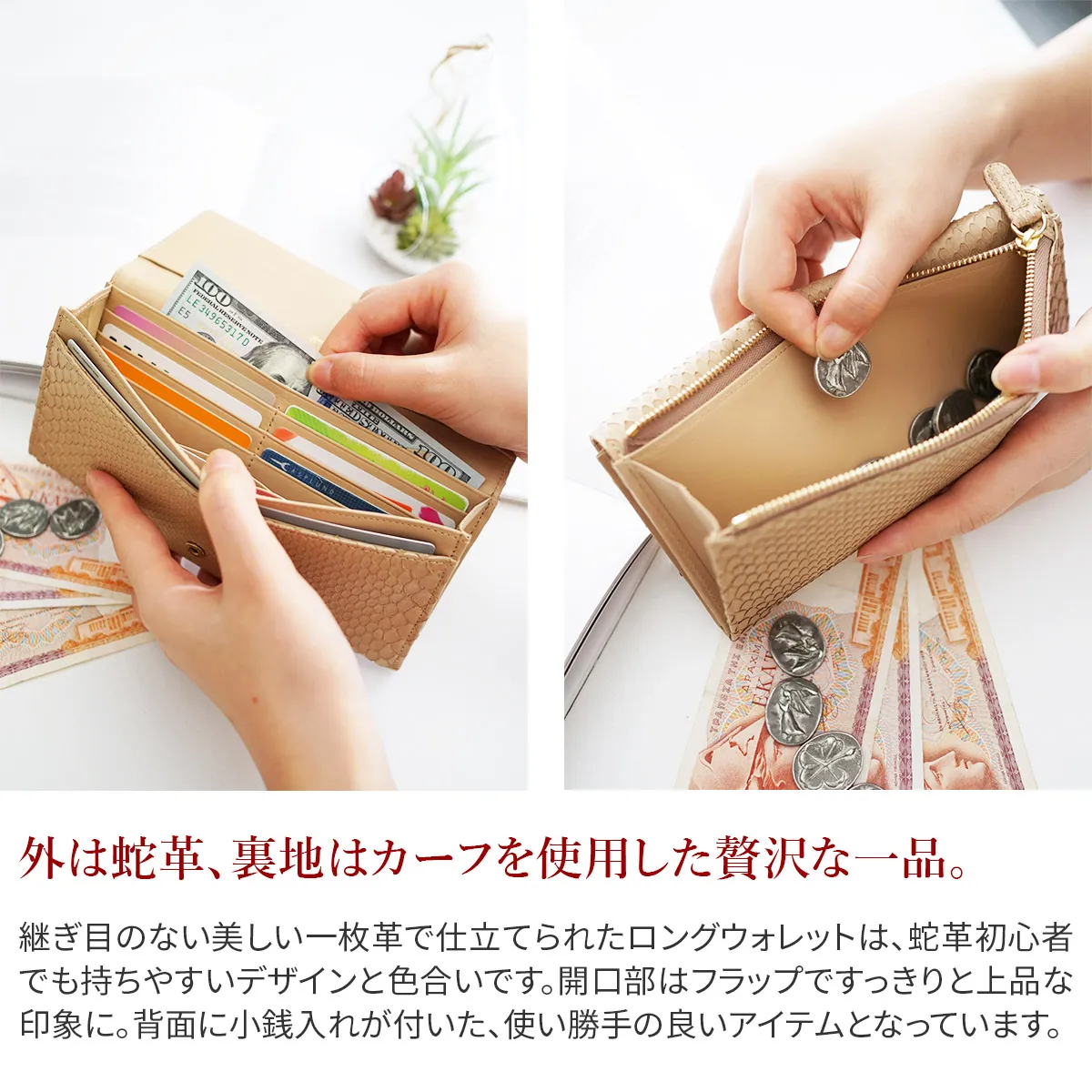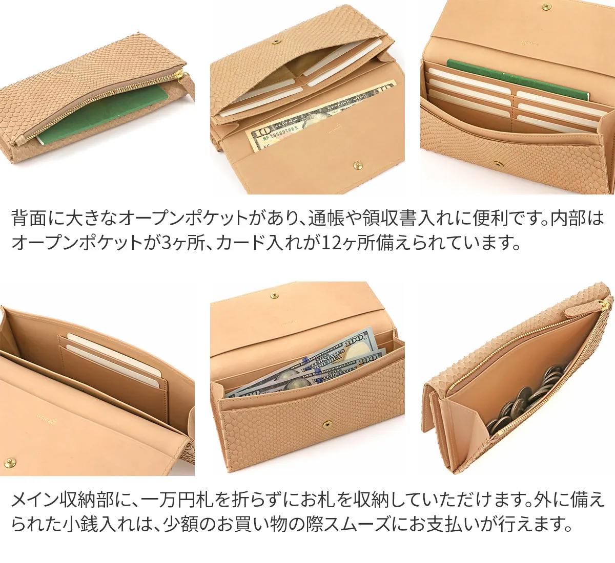 グレースパイソン=“優雅な蛇”金運を上げるといわれ縁起物の象徴とされる、蛇。性別を問わず、持つ人になじむのはgentenのパイソンレザーが革の本来のしなやかさ、うろこの風合いを大切に素上げでやわらかに仕上げているから。従来のダイヤモンドパイソンはパフっと柔らかな作りにしていましたが、グレースパイソンは革の薄さを活かすため芯材の厚みにも拘り、シャープですっきりとした仕様に。 〈素材の特性・メリット〉原皮:蛇革(東南アジア) 鞣し加工:日本 鞣しの種類:クロムフリー鞣し 特別なお手入れは必要ありませんが、お手入れ用品を使用する際はパイソン専用、もしくはエキゾチックレザー専用のものをご使用ください。使い込むごとにしっとりと手になじみ、銀面の艶が増してゆきます。 食用の副産物であるダイヤモンドパイソンを使用したグレースパイソンシリーズ。素上げで仕立てた立体感のある鱗が特徴です。開口部はフラップ式で大きく開き、フラップの裏にもポケットが付いた無駄のない仕様。中身も確認しやすく、スムーズなお支払いを行えます。