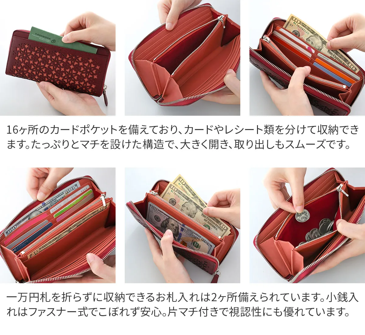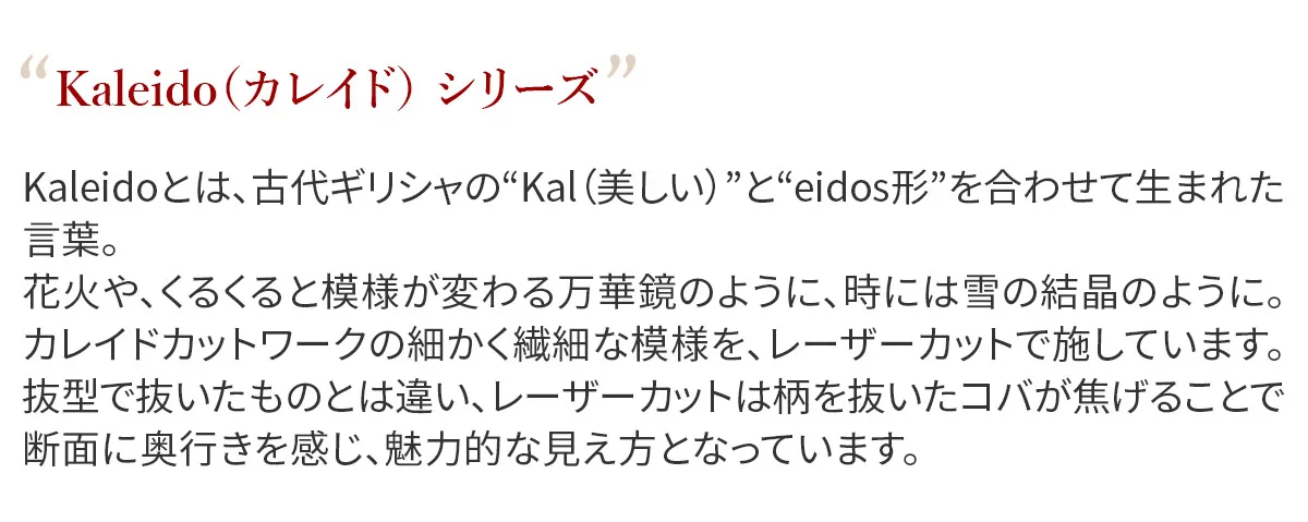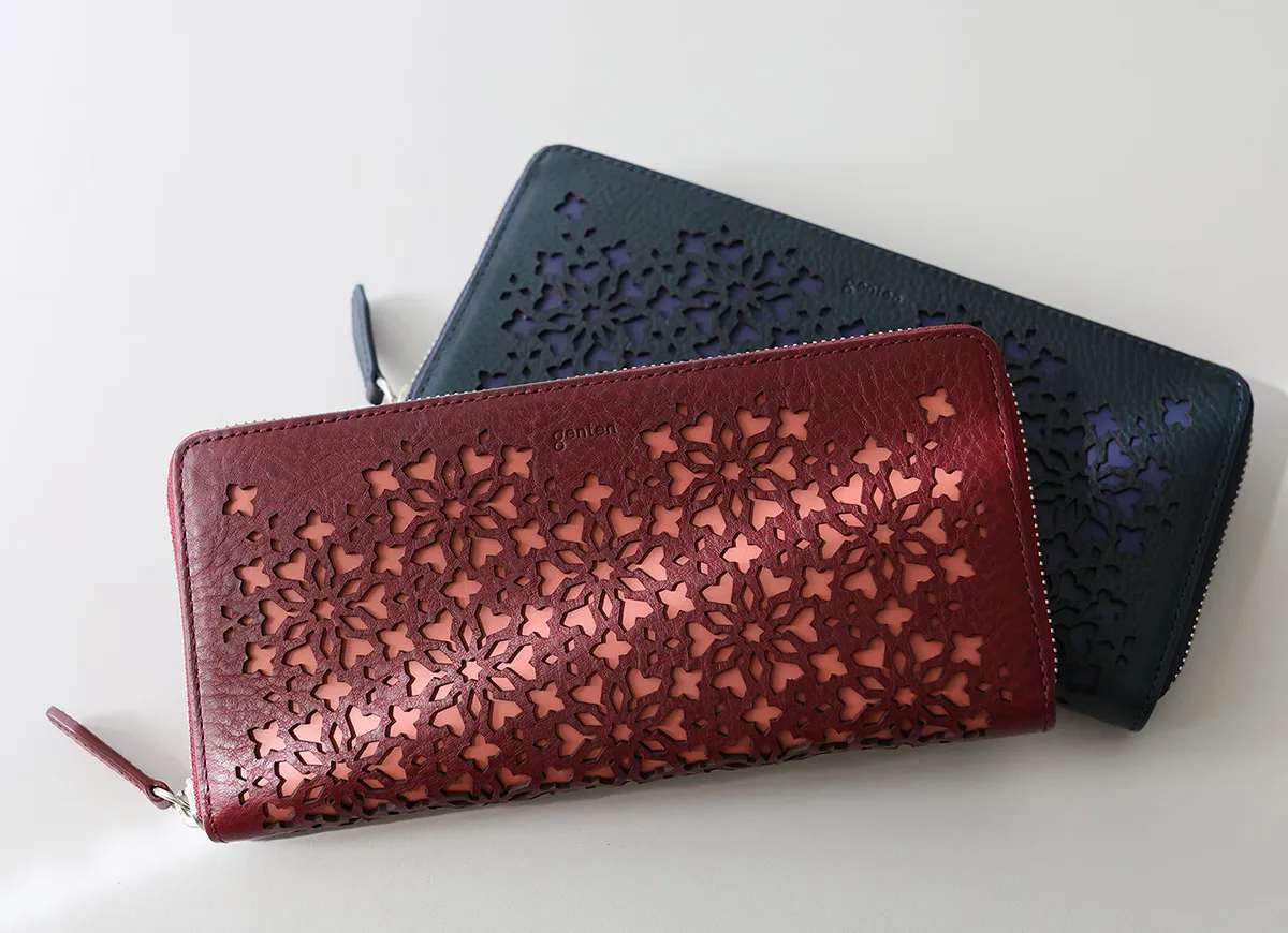 Kaleidoとは、古代ギリシャの“Kal(美しい)”と“eidos形”を合わせて生まれた言葉。花火のように、くるくると模様が変わる万華鏡のように、時には雪の結晶のように。カレイドカットワークの細かく繊細な模様を、レーザーカットで施しています。抜型で抜いたものとは違い、レーザーカットは柄を抜いたコバが焦げることで、断面に奥行きを感じ、魅力的な見え方となっています。 〈素材の特性・メリット〉 原皮:牛革/フランス 鞣し加工:イタリア 鞣しの種類:タンニン鞣し …Minerva BOXを使用。 浅い爪傷やチョークマークには、genten推奨クリーム類を柔らかな布当に少量とってやさしく拭くと、ある程度軽減されます。 カットワークの抜きの下には、少し色相の違う革の色を入れることで、柄を浮き立たせバッグの中でも目に入りやすく、手元に華やぎを与えてくれるデザインとなっています。ラウンドファスナー式の長財布は、カードや現金、レシートや通帳も収まる大容量収納が可能。膨らみにくい仕様でスマートにお持ちいただけます。
