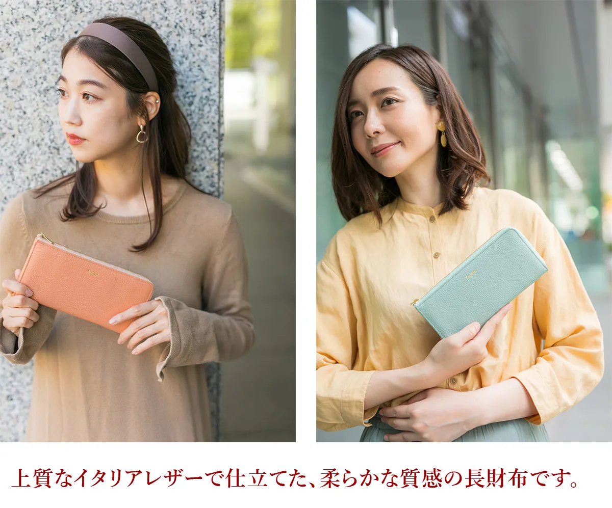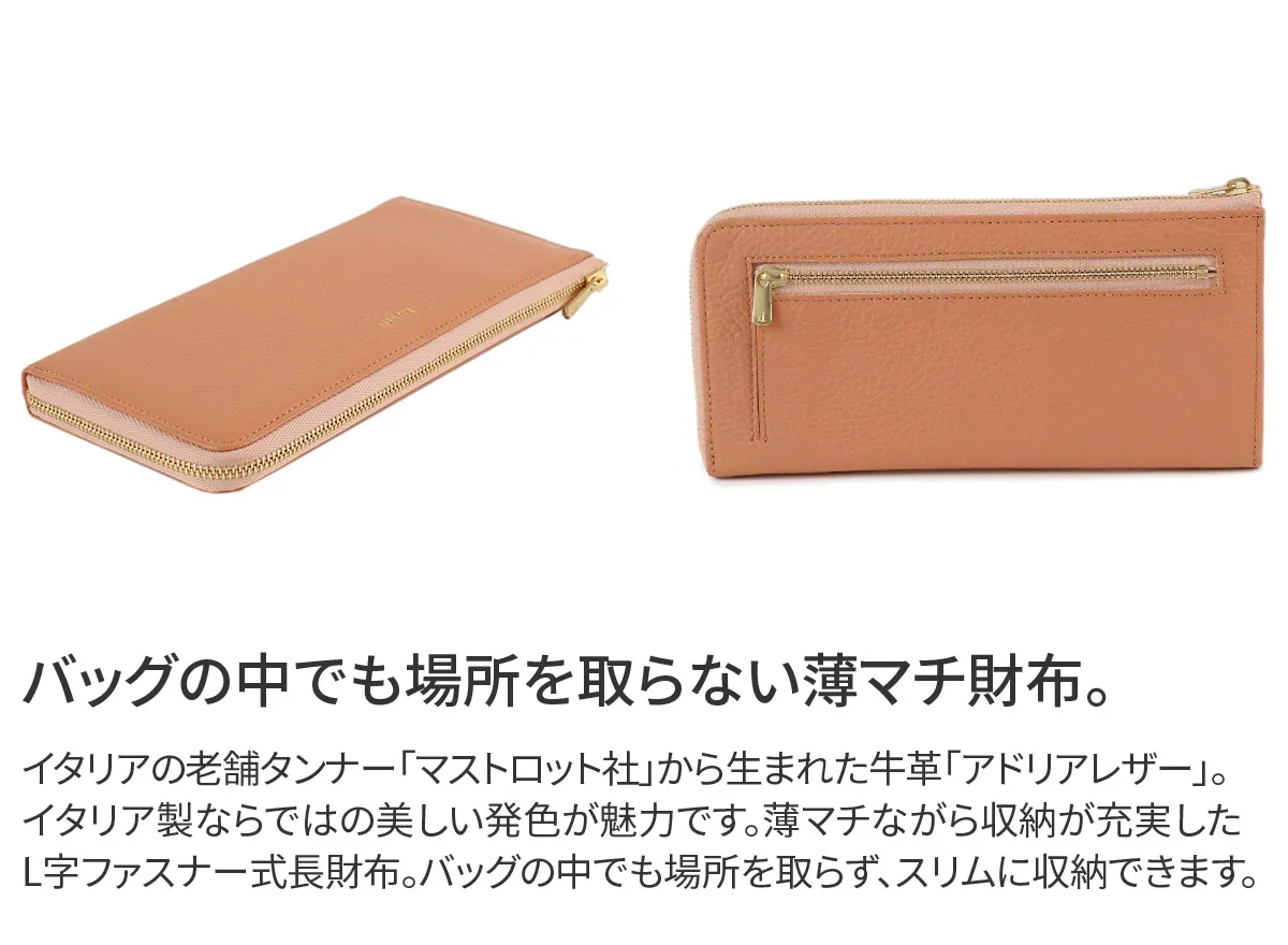 淡いパステルカラーが女性の心をくすぐるウォレットです。 イタリアの老舗タンナー「マストロット社」から生まれた牛革「アドリアレザー」を使用。ふんわりとやわらかな質感で、美しい発色となっています。メインファスナーを開くだけで、お札や小銭やカード類が一望できます。中央のコインケースはオープンタイプで見やすく、フリースペースには通帳収納も可能です。外側のポケットには小銭やカード等自由に収納できます。