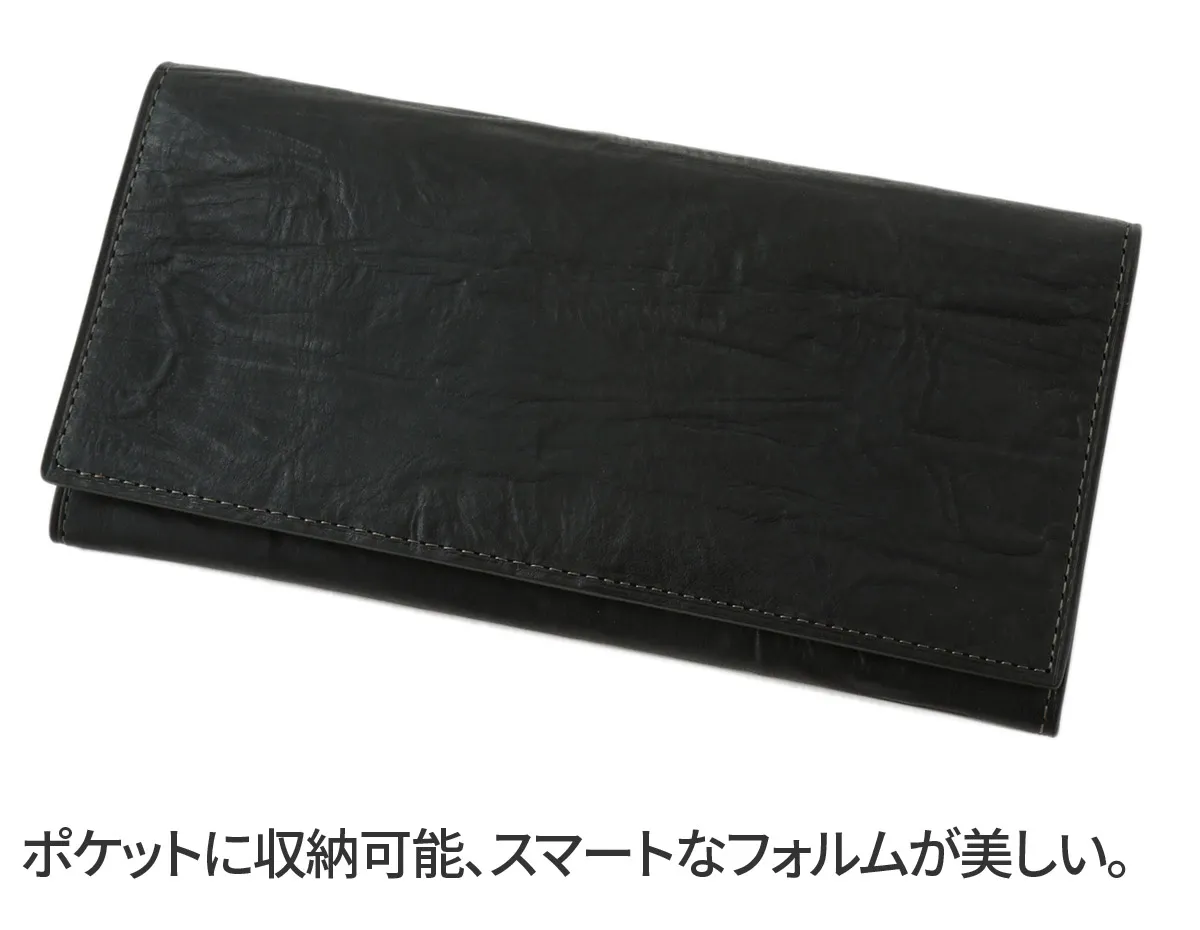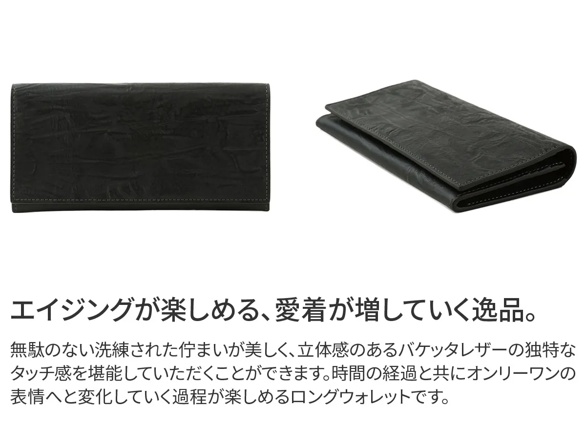 牛脚油でたっぷりと革に加工するバケッタ製法で仕上げたバケッタレザーのシリーズ。 加脂したオイルが抜けにくく、使い込んだときに独特の色艶が出てくる素材です。 イタリア・トスカーナの老舗タンナー「TEMPESTI(テンペスティ)」社製のシュリンクレザーを使用しており、手作業で絞り染色したからこそでてくる深いシワ感と色むらが特徴的なシリーズになっています。 マチ幅が2cmなのでジャケットの内ポケットなど、シルエットに響きにくいロングウォレットです。 オープン開閉なので、中身にもスムーズにアクセスしていただけます。
