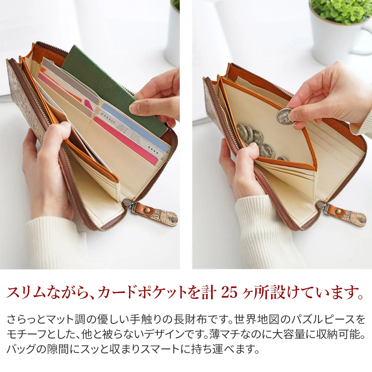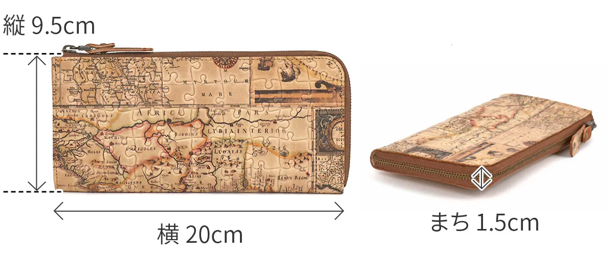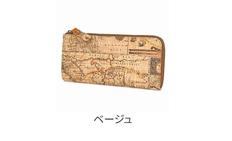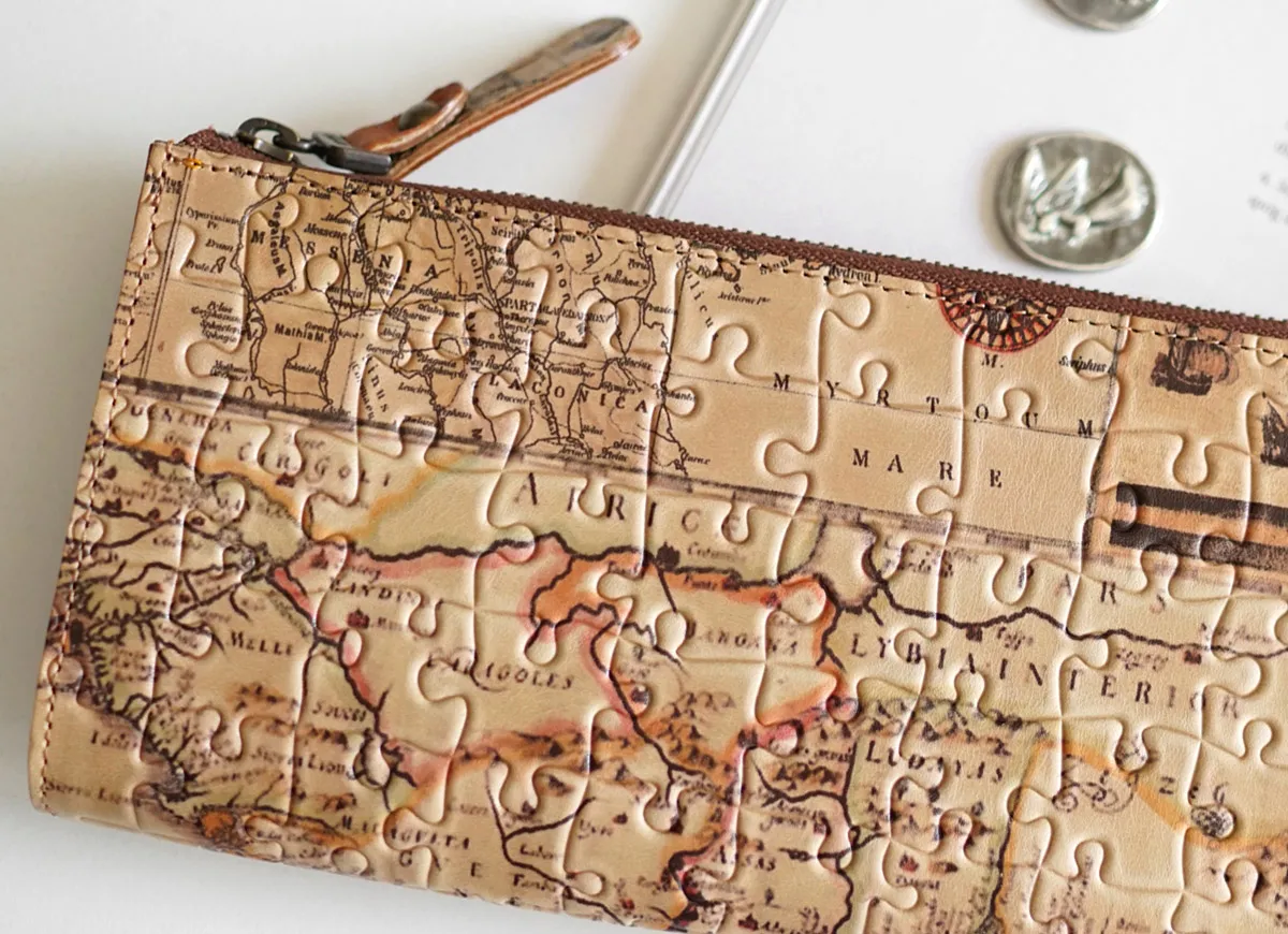レトロ調の世界地図のプリントにパズルの型押しを施したお財布シリーズ。アンティーク調の風合いで、一つ一つ柄が違います。 暖色系でまとめられた温かみのあるデザインの長財布です。しなやかなでご使用当初から扱いやすいヌメ革仕立て。ファスナーレスの内部は視認性が良く、お支払いをスムーズに行えます。