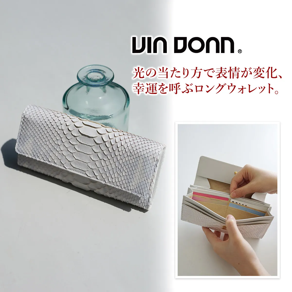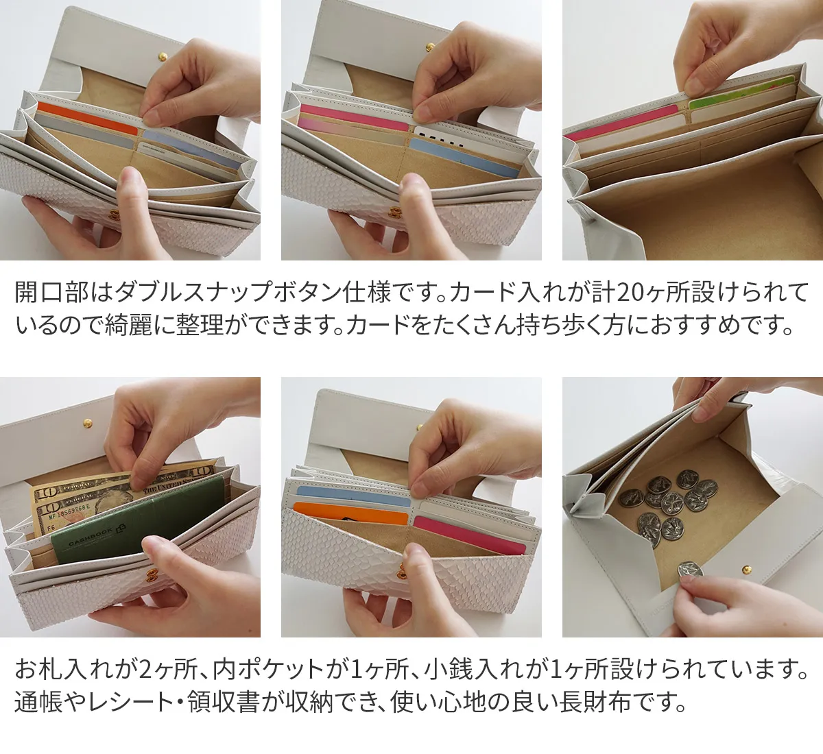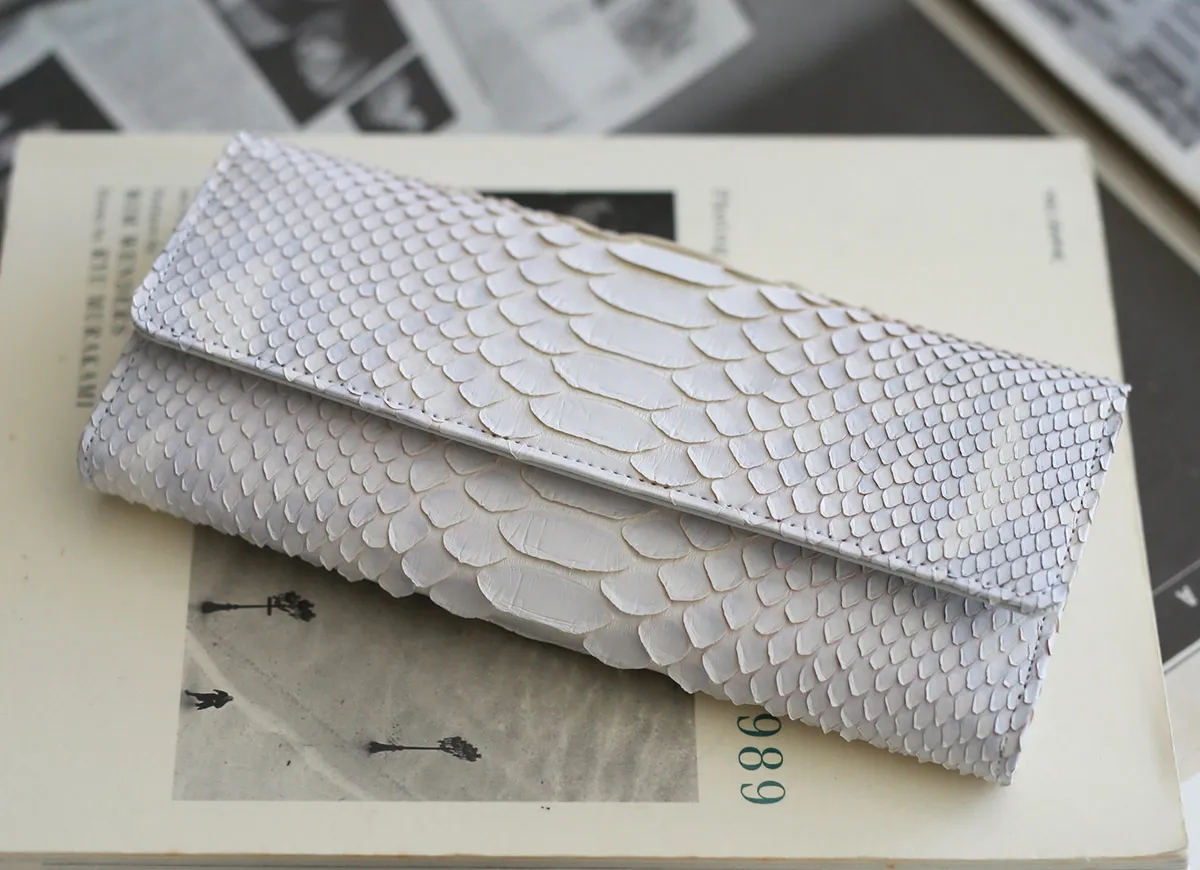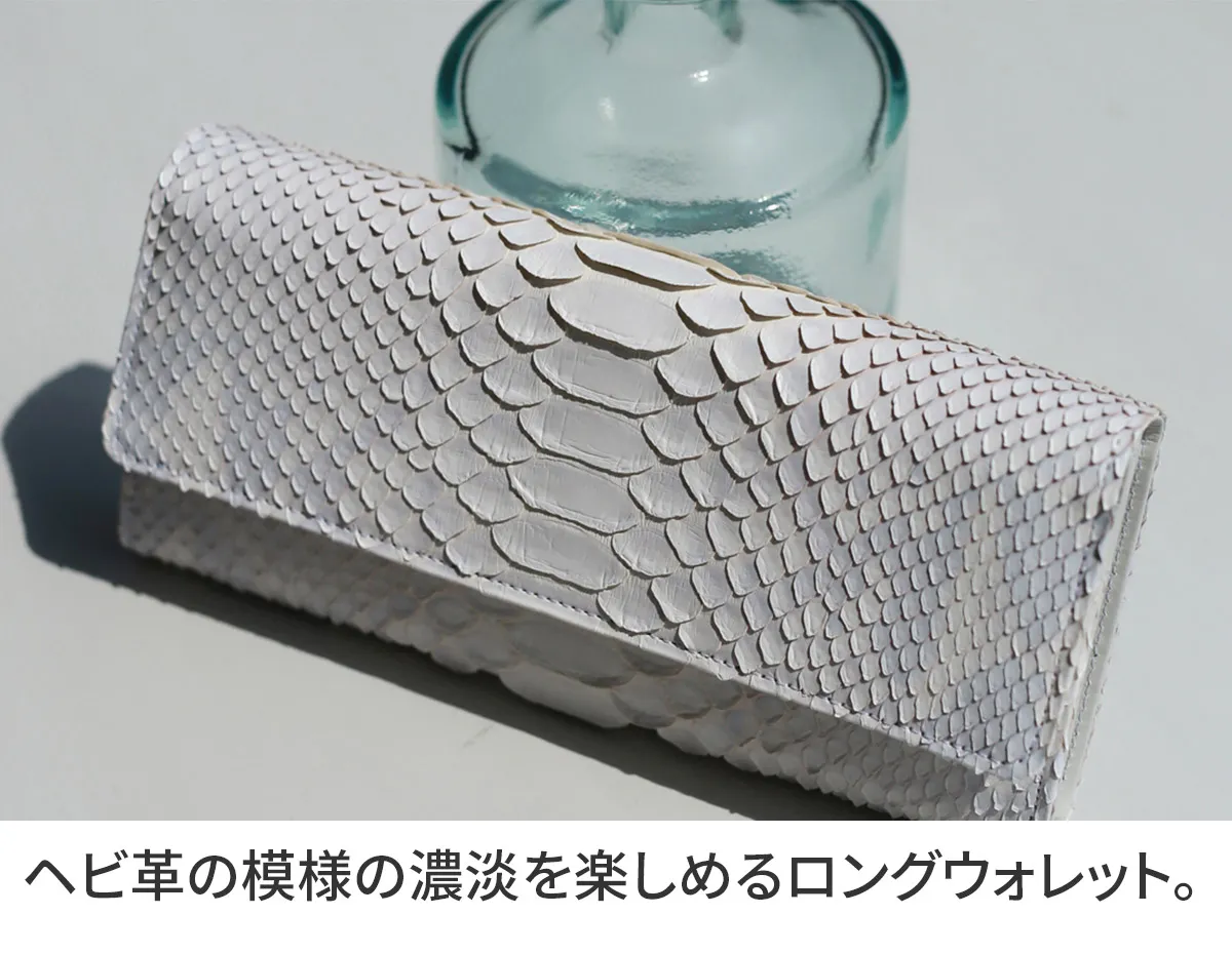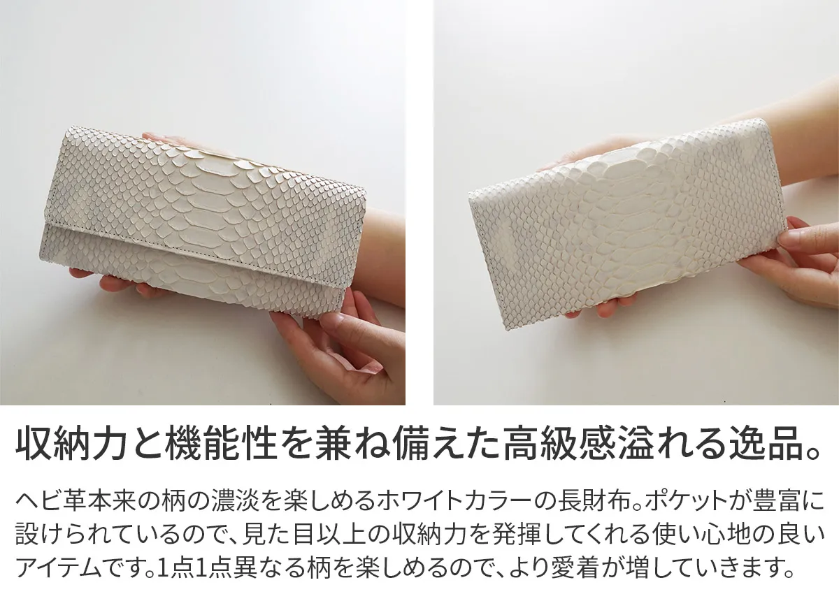 清楚で優しいホワイトカラーのパイソンにヘビ革本来の柄の濃淡をほのかに残したフェミニンなお財布シリーズ。 天然のパイソンの模様を薄く残した、ホワイトカラーが美しい長財布。 ポケットが豊富に設けられているので、大容量収納が可能です。 高級感溢れる、手元を華やかにしてくれる逸品です。