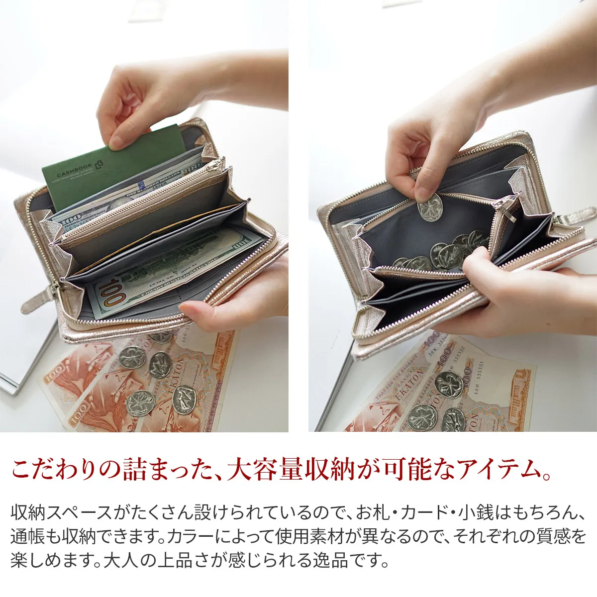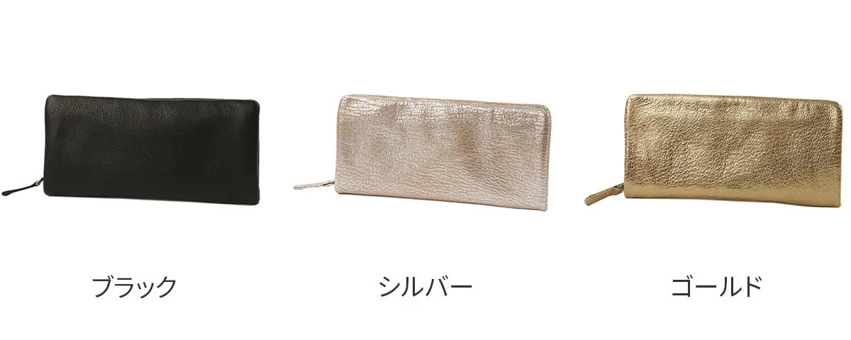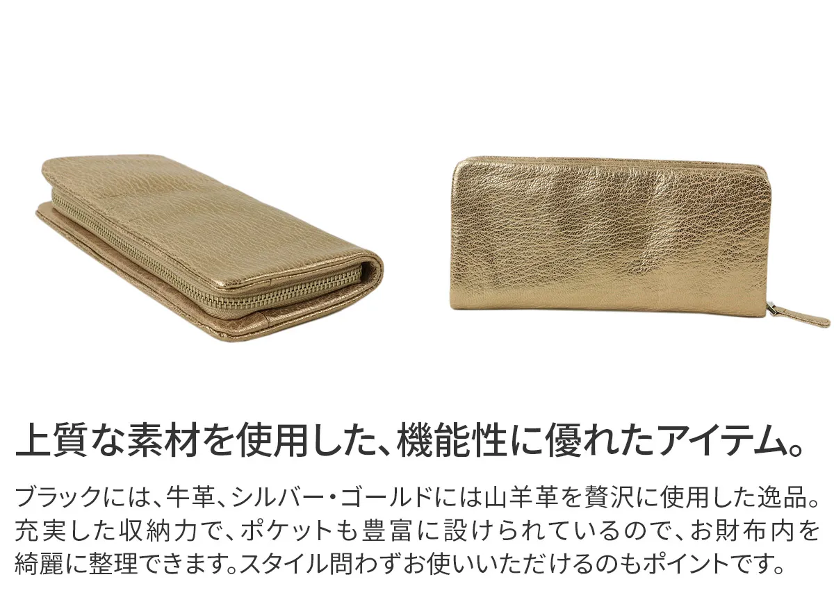 やわらかいソフトキップ(ブラック)、山羊革(シルバー・ゴールド)のやさしい手触りが心地良い使い勝手にもこだわったふっくら仕上げのお財布シリーズです。 上品な見た目で手元を彩る大容量収納が可能なロングウォレット。素材の柔らかさが癖になる逸品です。 お札入れやカード入れが豊富に設けられているので、たくさん収納ができます。 丁寧なステッチワークが魅力のこだわりが詰まったアイテムです。