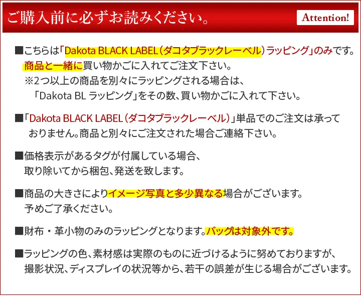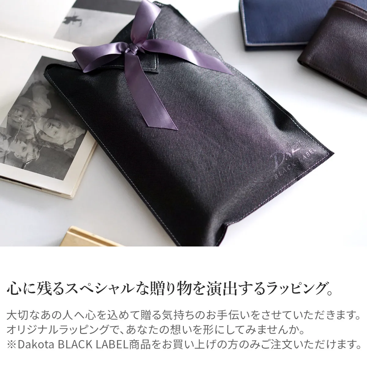 Dakota BLACK LABELオリジナルギフトラッピング ひとつひとつ丁寧に心を込めてお包みいたします。 ※Dakota BLACK LABEL商品をお買い上げの方のみご注文頂けます。 ※財布・長財布・小物のみのラッピングとなります。 (バッグ類の大型商品は対象外です)