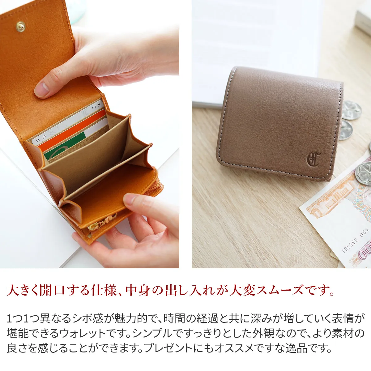 持つ人を選ばないシンプルデザインの二つ折り財布です。 艶めくレザー仕立てで、手元を上品に彩ってくれます。小さくても快適に使えるよう、奥は深めに手前は浅くなるよう段差をつけることで、中身が見やすい工夫が施されています。 L字ファスナー開閉の小銭入れや背面のポケット等、使い心地の良いウォレットです。 滑らかな質感のレザーが心地良く、経年変化を楽しみながら長くお使いいただけます。