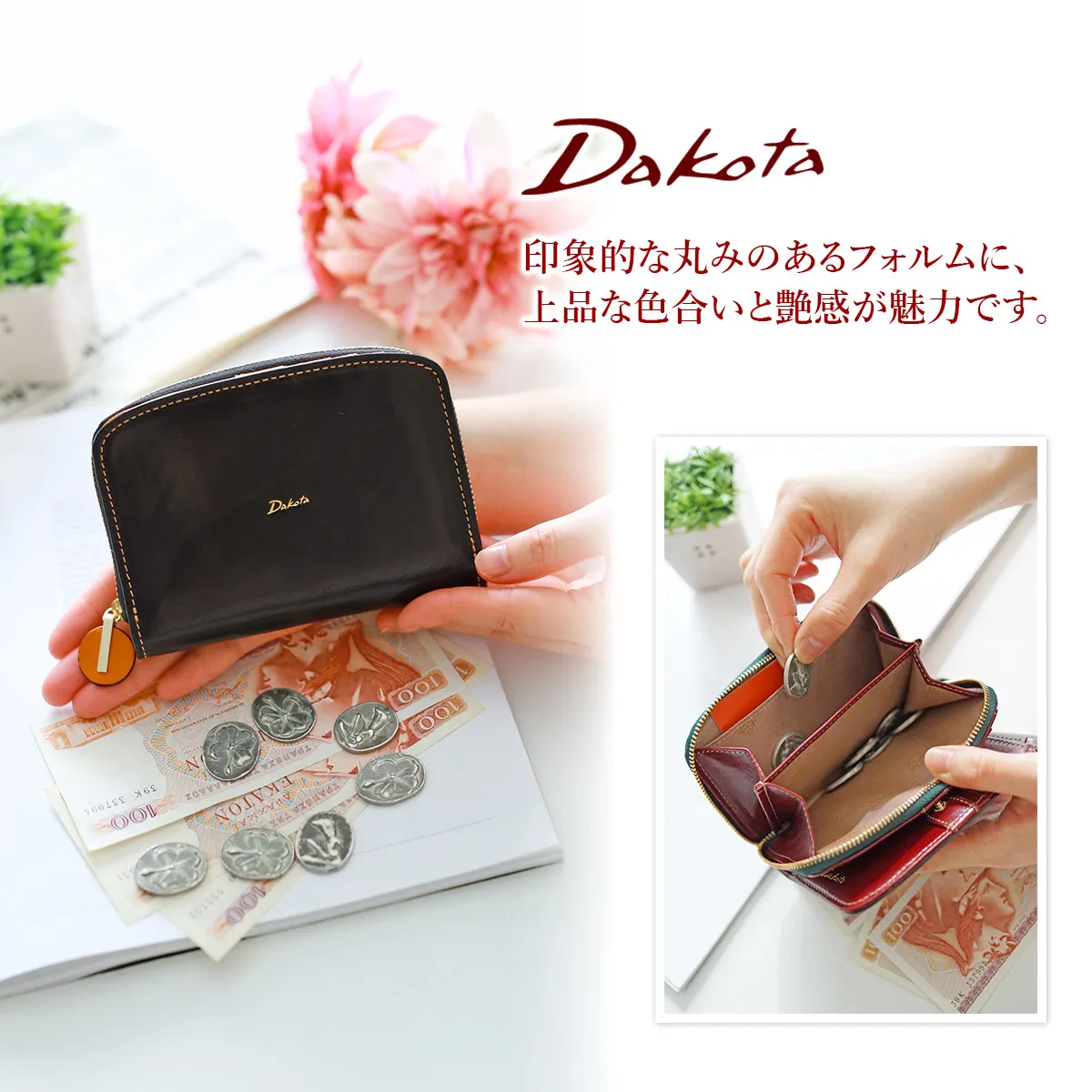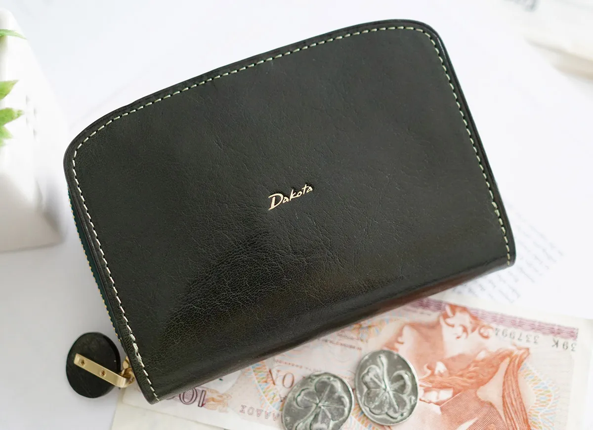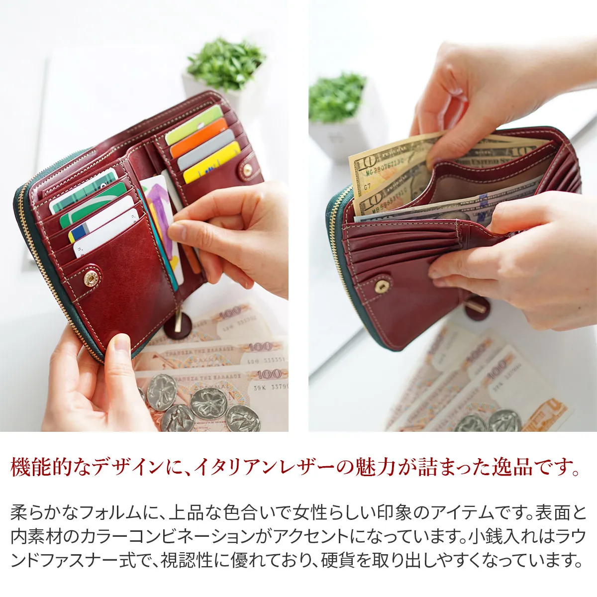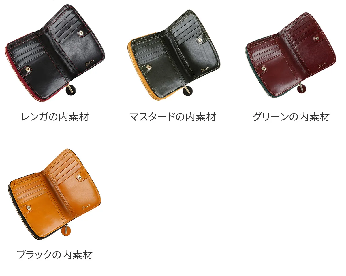 ショルダー革の天然シボや透明感と艶が際立つイタリアンレザーならではの魅力溢れる材料を使用しています。 革自体の美しさが伝わる様、デザインを極力シンプルにし、丸みを帯びたシルエットで特徴を出しています。 円形の引手と中作りのカラーコンビがアクセントのシンプル&モダンなシリーズです。 柔らかなフォルムに、上品な色合いで女性らしい印象のアイテムです。表面と内素材のカラーコンビネーションがアクセントになっています。小銭入れはラウンドファスナー式で、視認性に優れており、硬貨を取り出しやすくなっています。