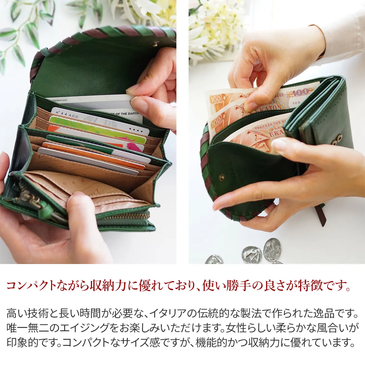 2色のかがりとレーザーカットで刻まれた柄がポイントの女性らしく柔らかな印象のシリーズです。中央にラッキーモチーフである星がさりげなく刻まれています。バケッタ製法で作られたイタリアンレザーを使用し、経年変化も楽しめるシリーズです。 高い技術と長い時間が必要な、イタリアの伝統的な製法で作られた逸品です。唯一無二のエイジングをお楽しみいただけます。女性らしい柔らかな風合いが印象的です。コンパクトなサイズ感ですが、機能的かつ収納力に優れています。