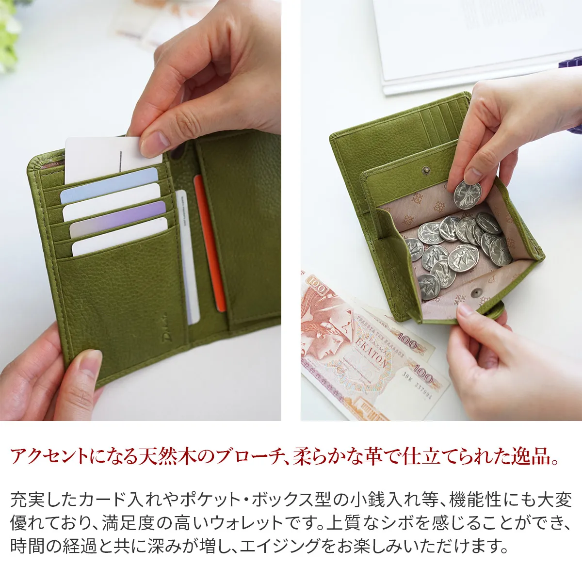時流に沿ったスマートで都会的な出で立ち・機能でありつつ、植物や空を連想させる色味や天然木のブローチがどこか安心感やぬくもりを感じさせるお財布です。 唯一無二の存在感を放つオリジナルの天然木ブローチは、将棋駒の町で知られる山形県天童市で製作されています。 長い年月をかけて木材に向き合い、培った木工技術による賜物です。 日々移りゆく世情のなかで、私たちにとって普遍的な存在である「自然」からインスパイアされたシリーズです。 比較的コンパクトなサイズ感で、片手でさっと取り出せるウォレットです。 発色の良い深みのあるカラーで、手元を上品に魅せてくれます。