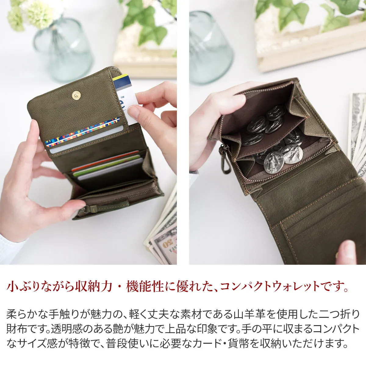 ゴートの魅力は、軽くて丈夫なこと。薄い革ですが、繊維質が緊密で弾力があるため、銀面(革の表面)の強度があります。それでいて、しなやか。さらに雨染みにも強く、扱いやすい革です。 ムラ染めをしたあとに、革の表面にメノウなどの石をあてて磨き上げ、摩擦によって透明感のある艶や色の濃淡を出す、グレージング加工というひと手間がかけられています。 柔らかな手触りが魅力の、軽く丈夫な素材である山羊革を使用した二つ折り財布です。透明感のある艶が魅力で上品な印象です。手の平に収まるコンパクトなサイズ感が特徴で、普段使いに必要なカード・貨幣を収納いただけます。