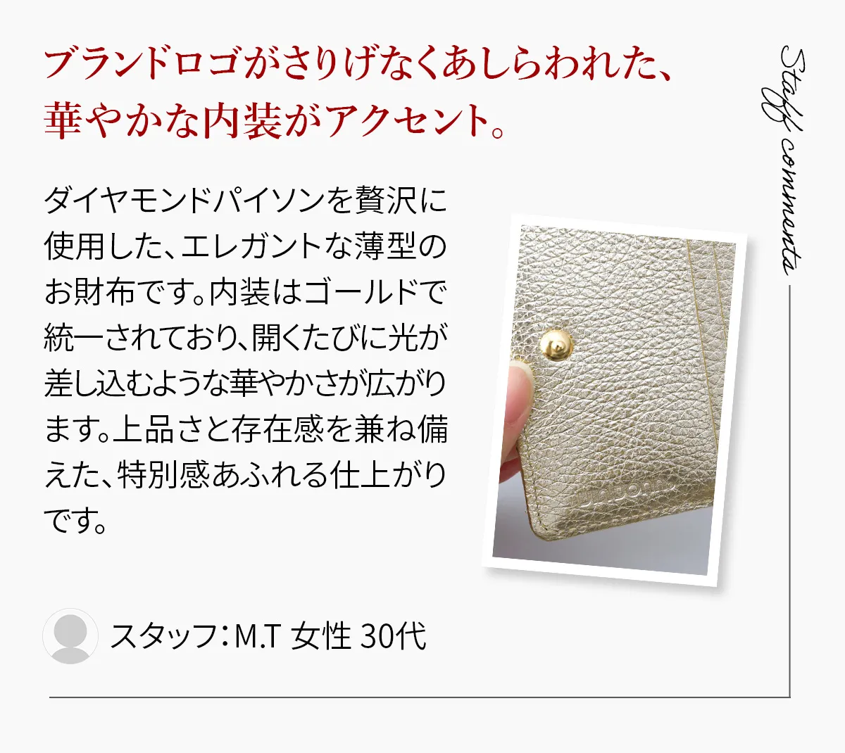 ※商品の色、素材感は実際のものに近づけるように努めておりますが、撮影状況、ディスプレイの状況等から、若干の誤差が生じる場合がございます。→詳しくはこちら。 特に、屋外での撮影画像は、光の当たり具合で色味が違って見える場合があります。商品の色味につきましては、商品のディテール画像をご参照ください。