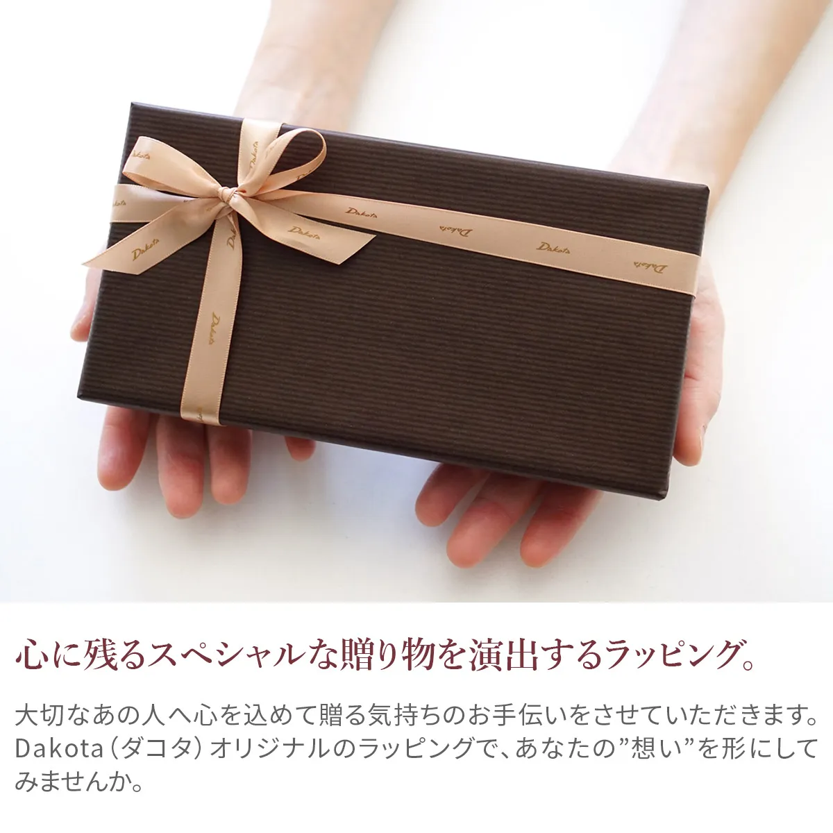 Dakota(ダコタ)オリジナルギフトラッピング ひとつひとつ丁寧に心を込めてお包みいたします。 ※財布・長財布・小物のみのラッピングとなります。(バッグ類の大型商品は対象外です)