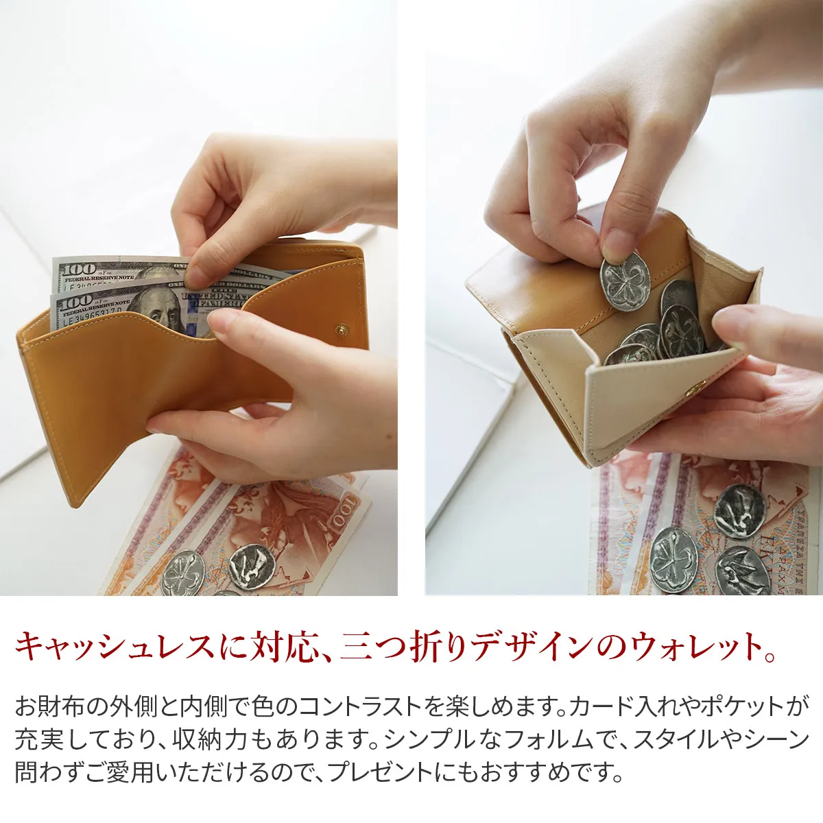 genten定番シリーズ、ピアチェーレをリニューアル。 上質なカーフのきめ細やかな手触りや見た目はそのままに、革の鞣しの仕方を変更し徐々に色がさめていく経年変化が特徴の白鞣しに変更。 カーフ特有の細かなトラの表情も革の個性としてお楽しみください。 手に馴染むしなやかな質感で経年変化が楽しめる逸品。 三つ折りデザインでコンパクトでありながら、必要な機能が詰め込まれており、 キャッシュレスに対応した、現代とマッチするアイテムです。