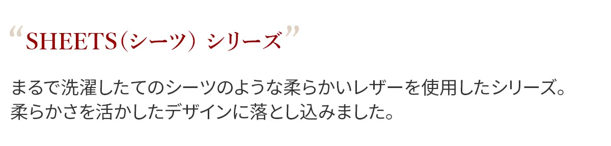 まるで洗濯したてのシーツのような柔らかいレザーを使用したシリーズ。柔らかさを活かしたデザインに落とし込みました。 使い始めから快適にご使用できる、ソフトで軽量なお財布です。無駄を省いたシンプルな構造で、お金やカードの管理がしやすく、お支払いの際もスムーズです。ミニバッグや上着ポケットにサッと収まり持ち運びにも大変便利◎