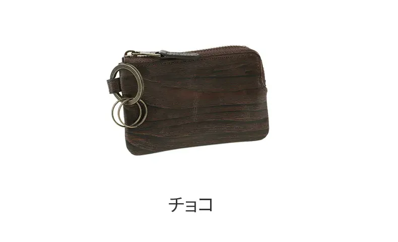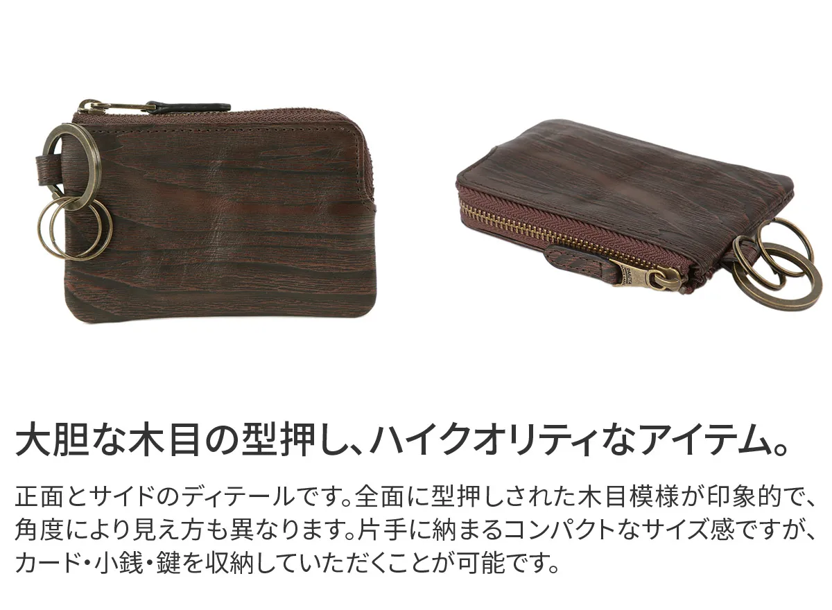 牛革に木目の型押しが目を引くシリーズ。 型押しの凹の部分に色を加える事でより立体感を感じられます。 また、木目の出方が1本ずつ違い一つとして同じ見え方の物はありません。 革でありながら木の温もりを感じさせる独創的で存在感のあるシリーズに仕上げました。 外側にも内側にもキーリングが付いており、日常生活で必要なものをまとめていただけます。 使う程に艶が増し、ゆっくりと手に馴染んでいきます。