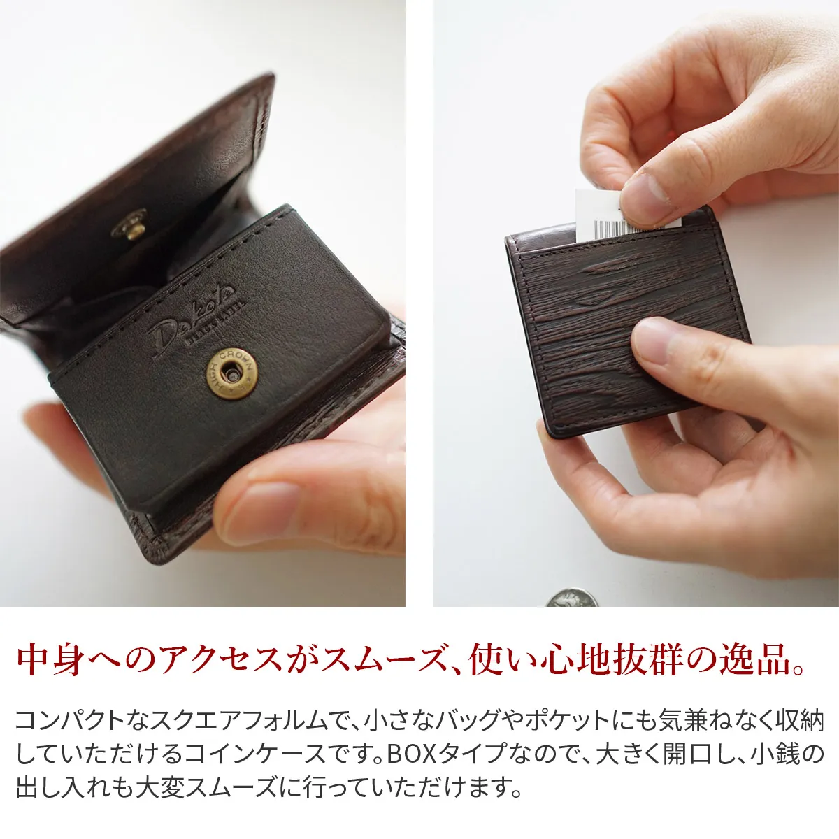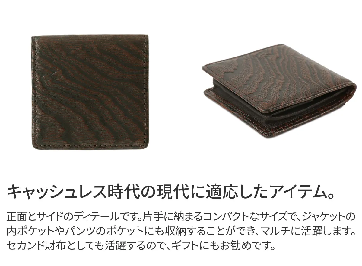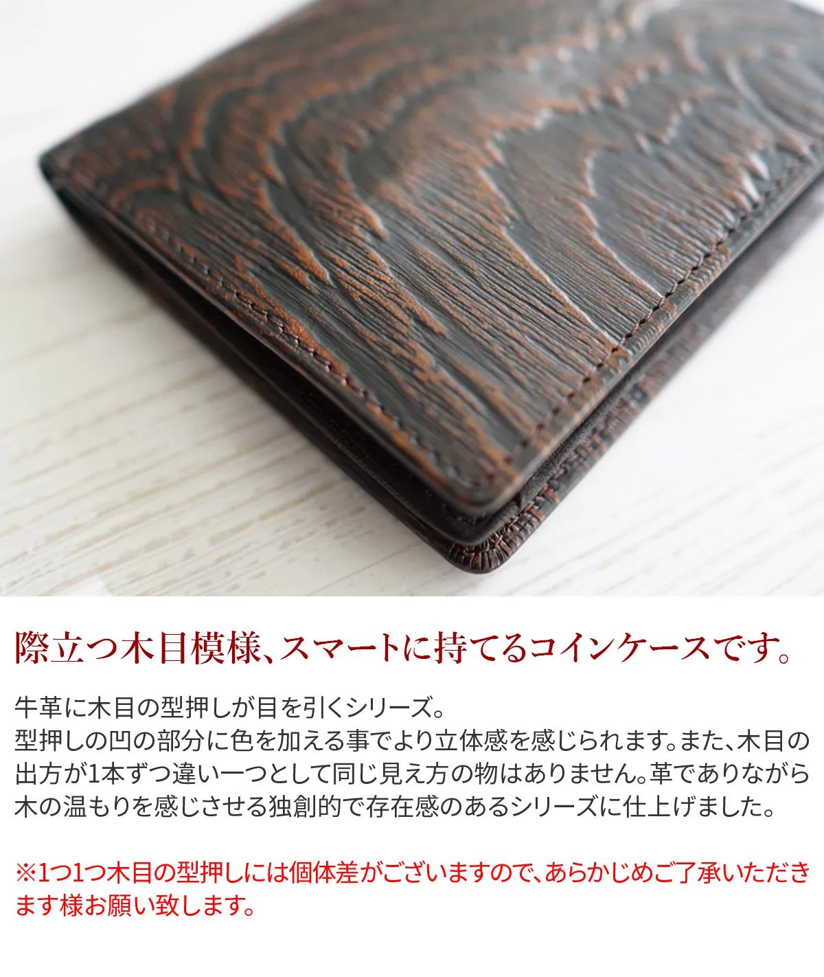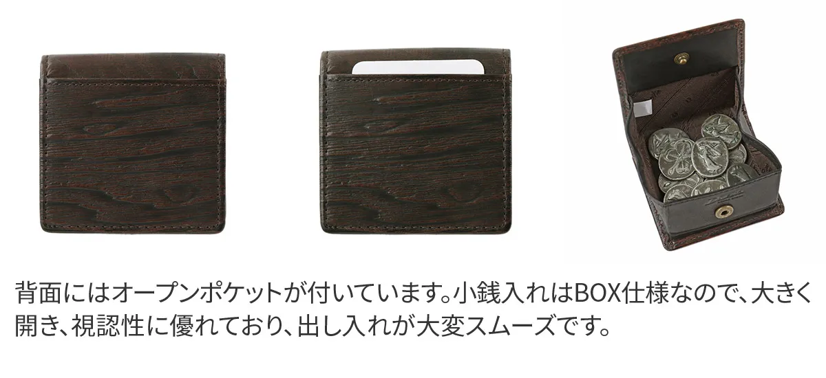 牛革に木目の型押しが目を引くシリーズ。 型押しの凹の部分に色を加える事でより立体感を感じられます。 また、木目の出方が1本ずつ違い一つとして同じ見え方の物はありません。 革でありながら木の温もりを感じさせる独創的で存在感のあるシリーズに仕上げました。 BOXタイプなので、大きく開口するので、視認性に優れており、出し入れがスムーズです。