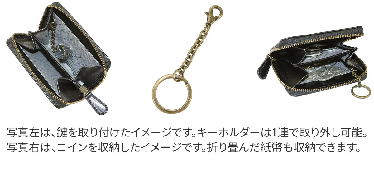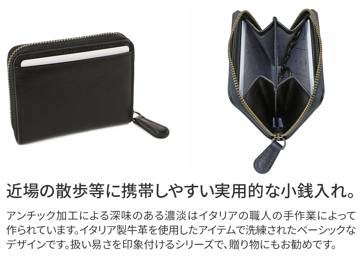 アンチック加工による深味のある濃淡はイタリアの職人の手作業によって作られているものです。 イタリアらしさを感じる発色の強いカラーをベーシックなデザインに仕立て、扱い易さを印象付けるシリーズとなっています。 コインケース内部には取り外しが可能なキーホルダーが一連ついており、無くしやすい鍵を取り付けて収納していただけます。 カードを収納していただけるポケットも備え付けられており、コンパクトながらも日常的に活躍してくれるアイテムとなっております。